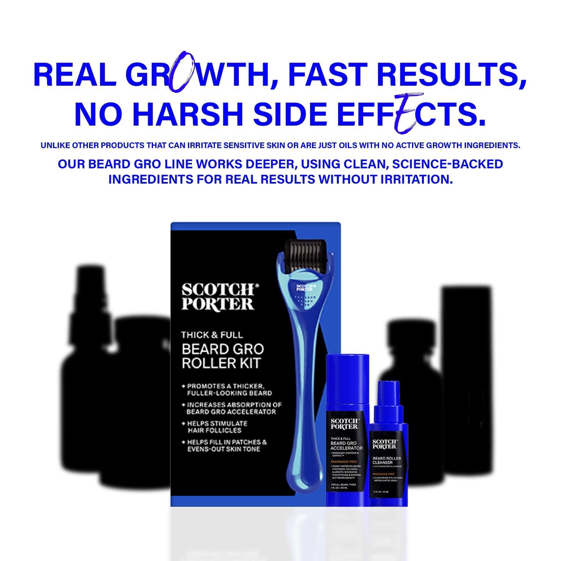 Stimulate and strengthen with an at-home beard derma roller and cleanser that prepare the skin for growth serum, using a microneedle roller designed for beard areas to improve serum absorption, while the cleansing spray keeps the tool fresh and regular use supports fuller-looking growth, including:
