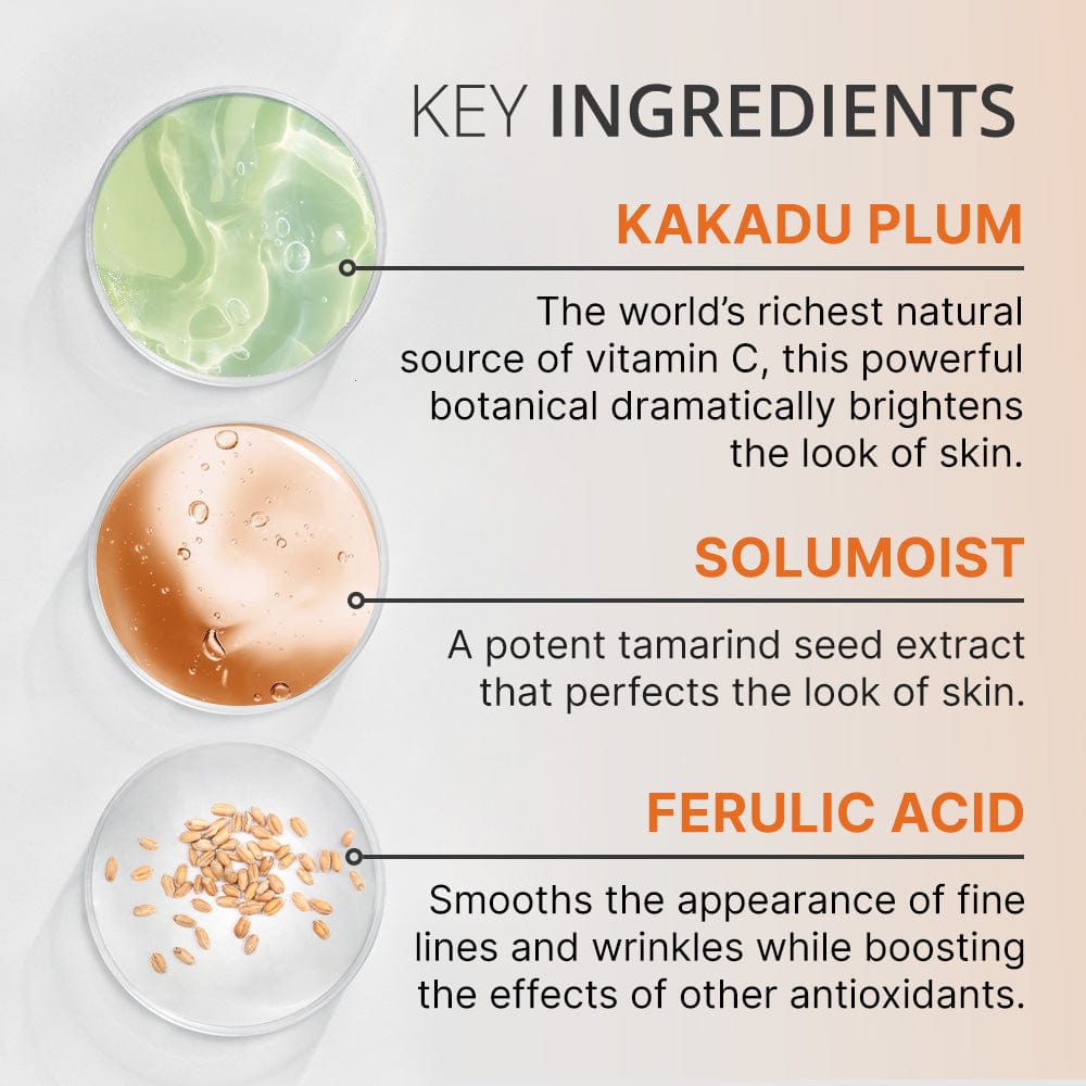 VITAMIN C SERUM: This cutting-edge serum is designed to unveil a brighter looking complexion. Infused with Kakadu Plum, Tamarind, and Ferulic Acid, it effectively reduces the appearance of dark spots, resulting in a more even and radiant-looking skin