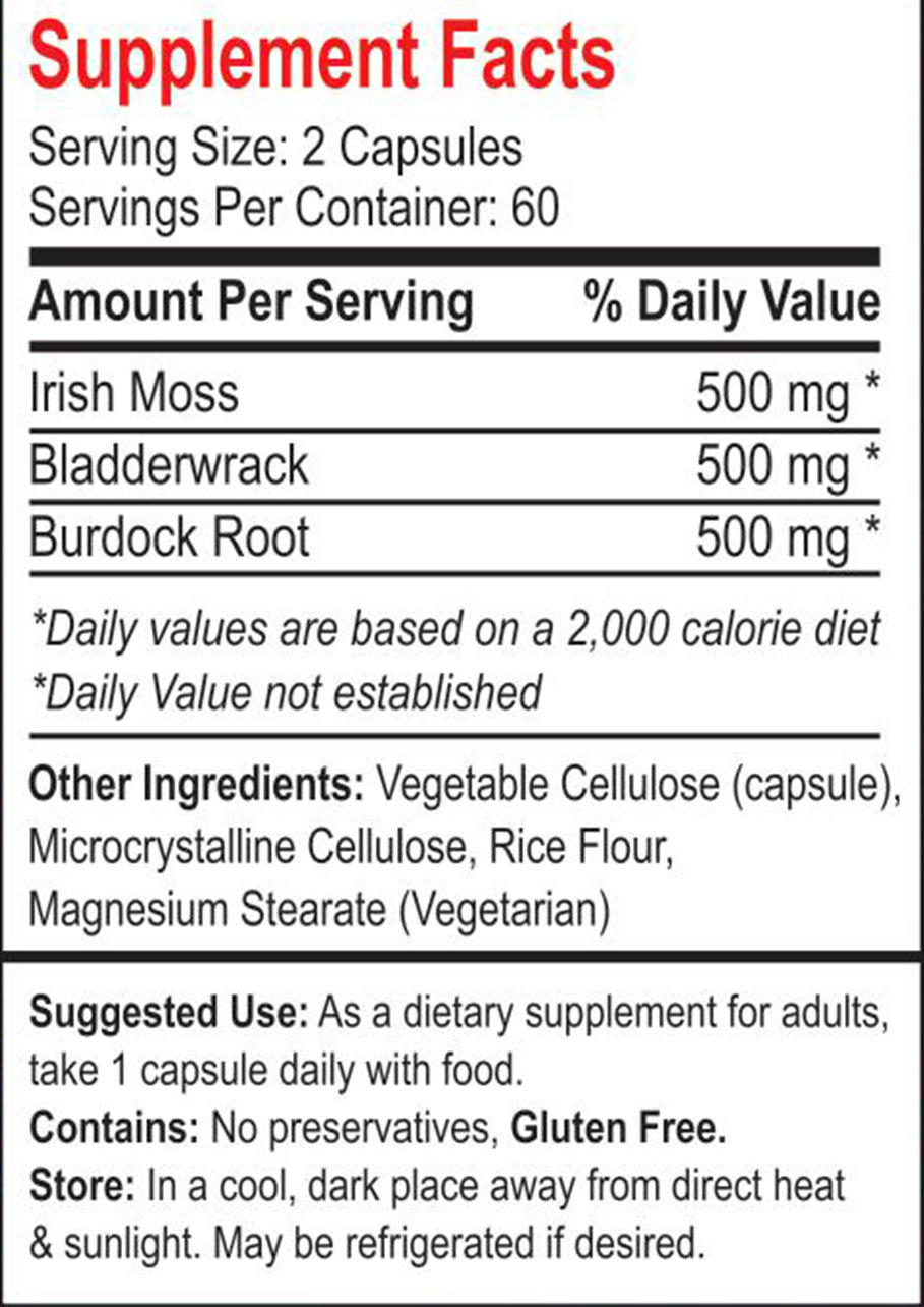 SEA MOSS cell food Capsules are meticulously crafted with 500mg of Irish Sea Moss, 500mg of Bladderwrack, and 500mg of Burdock Root, providing 102 essential minerals crucial for optimal cell function and overall health. This unique blend merges SEA MOSS and BLADDERWRACK, offering 92 vital nutrients, while BURDOCK ROOT supplements it with an additional 10%, creating a complete body supplement. It's 100% natural and wildcrafted to ensure the highest quality.