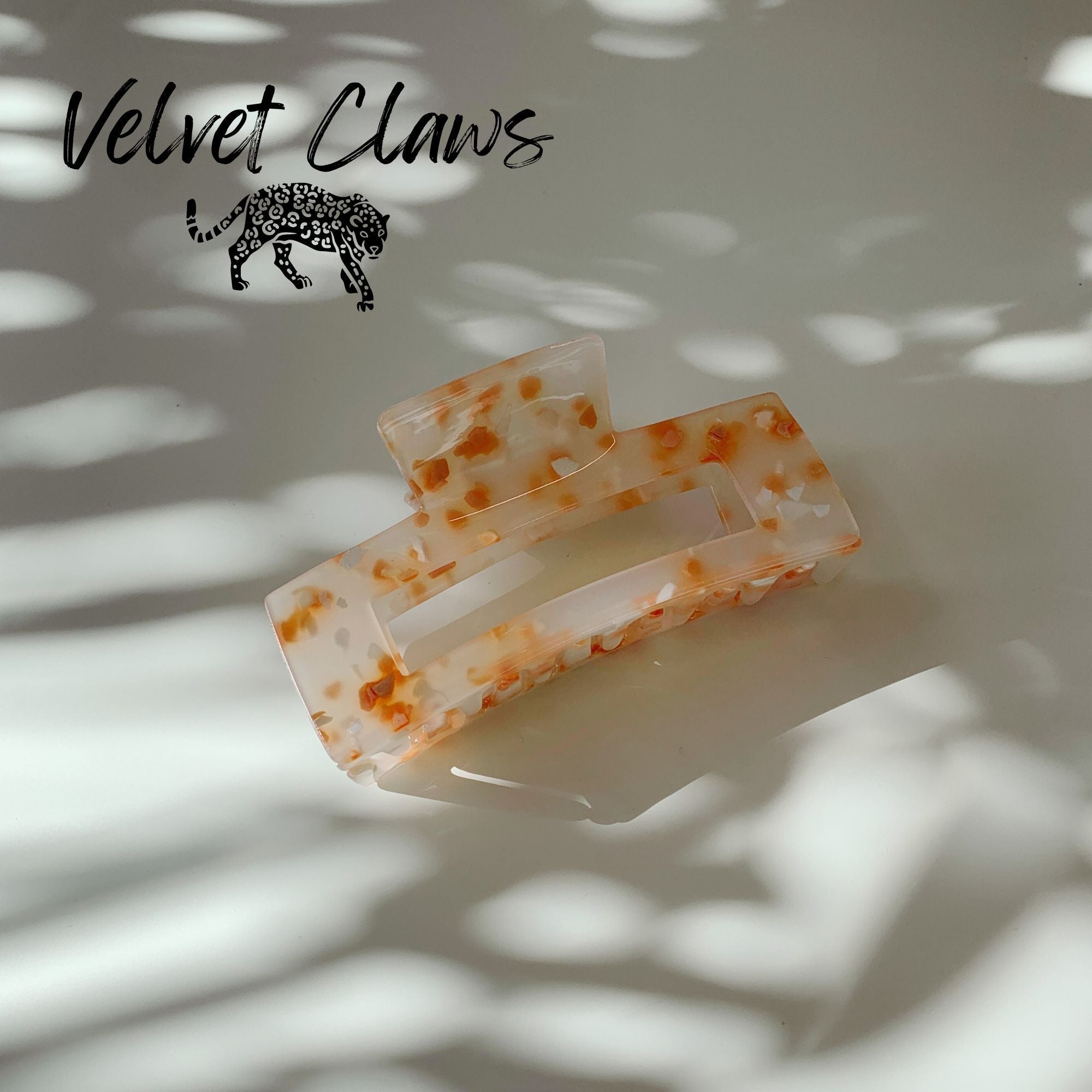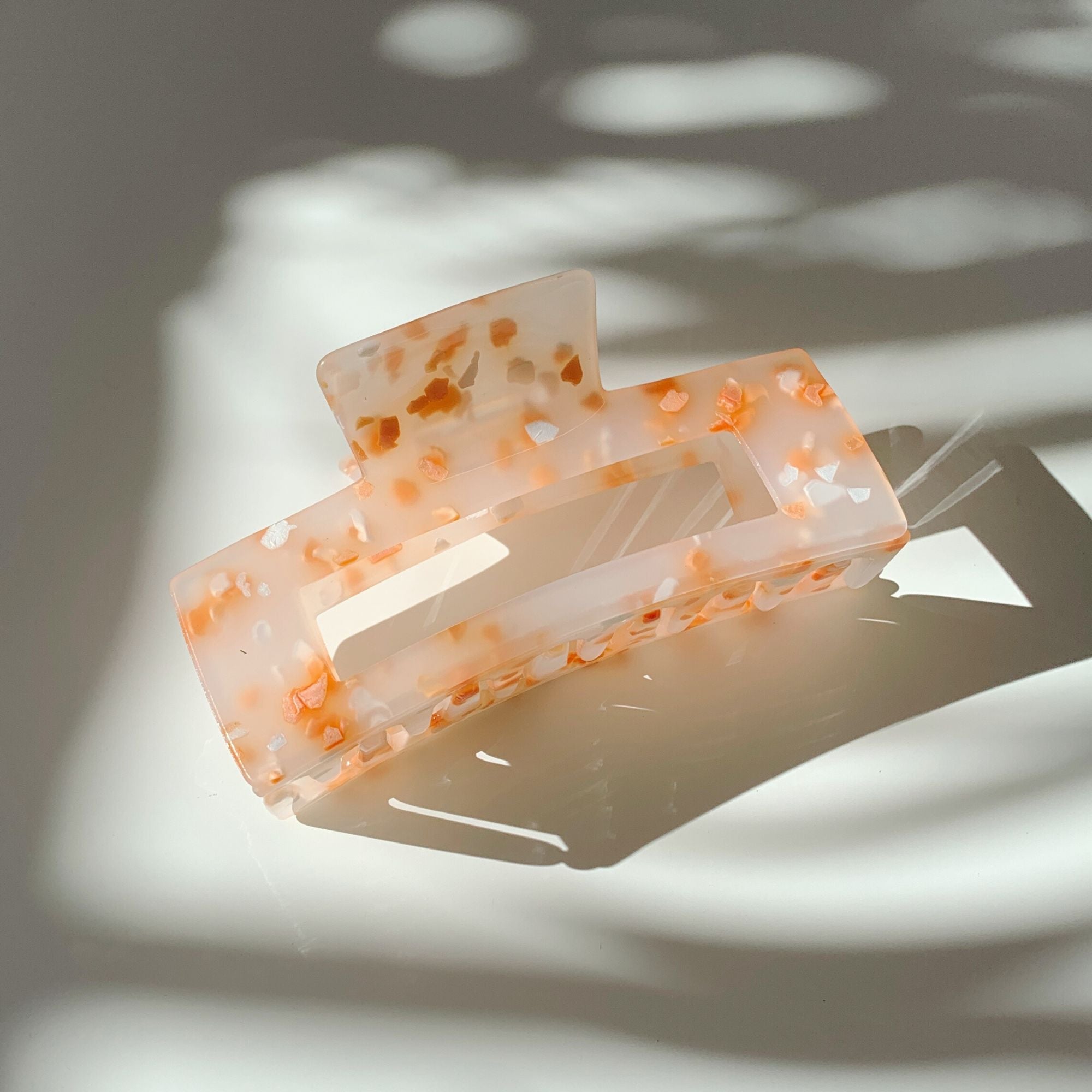 From Velvet Claws, a unique hair claw clip adorned with gorgeous peach and white confetti suspended in a milky translucent white background for a beautiful and professional way to hold your hair.