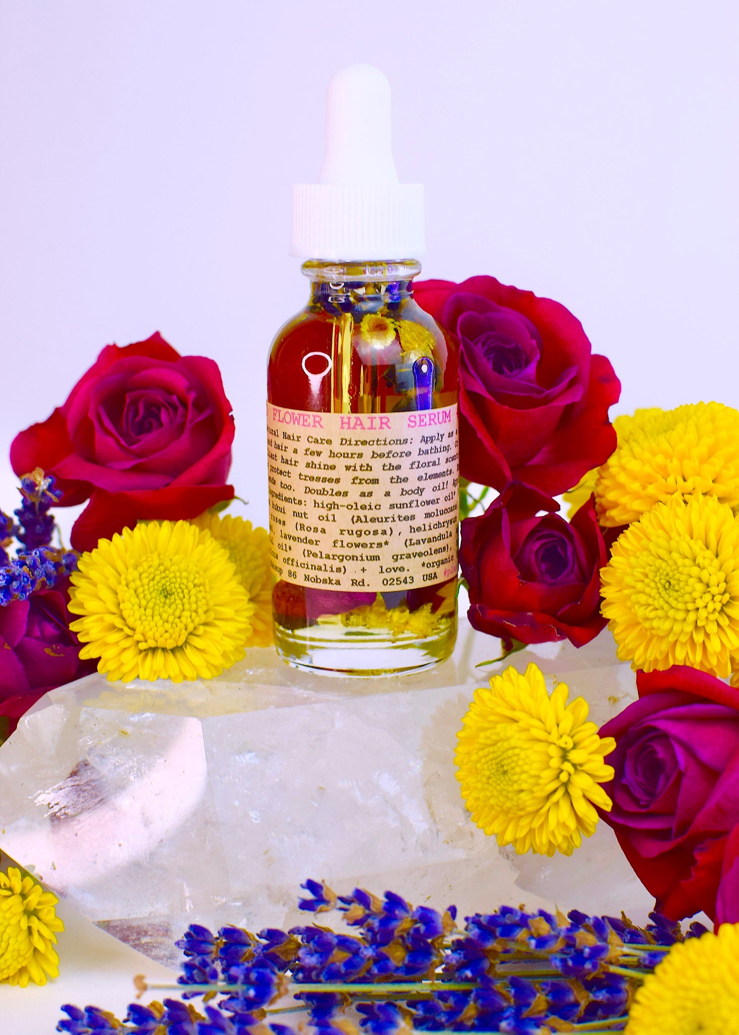 Includes: a 1oz (30ml) reusable glass bottle with dropper of Wild Flower Hair Serum. Shipped + packaged with love and nature friendliness.