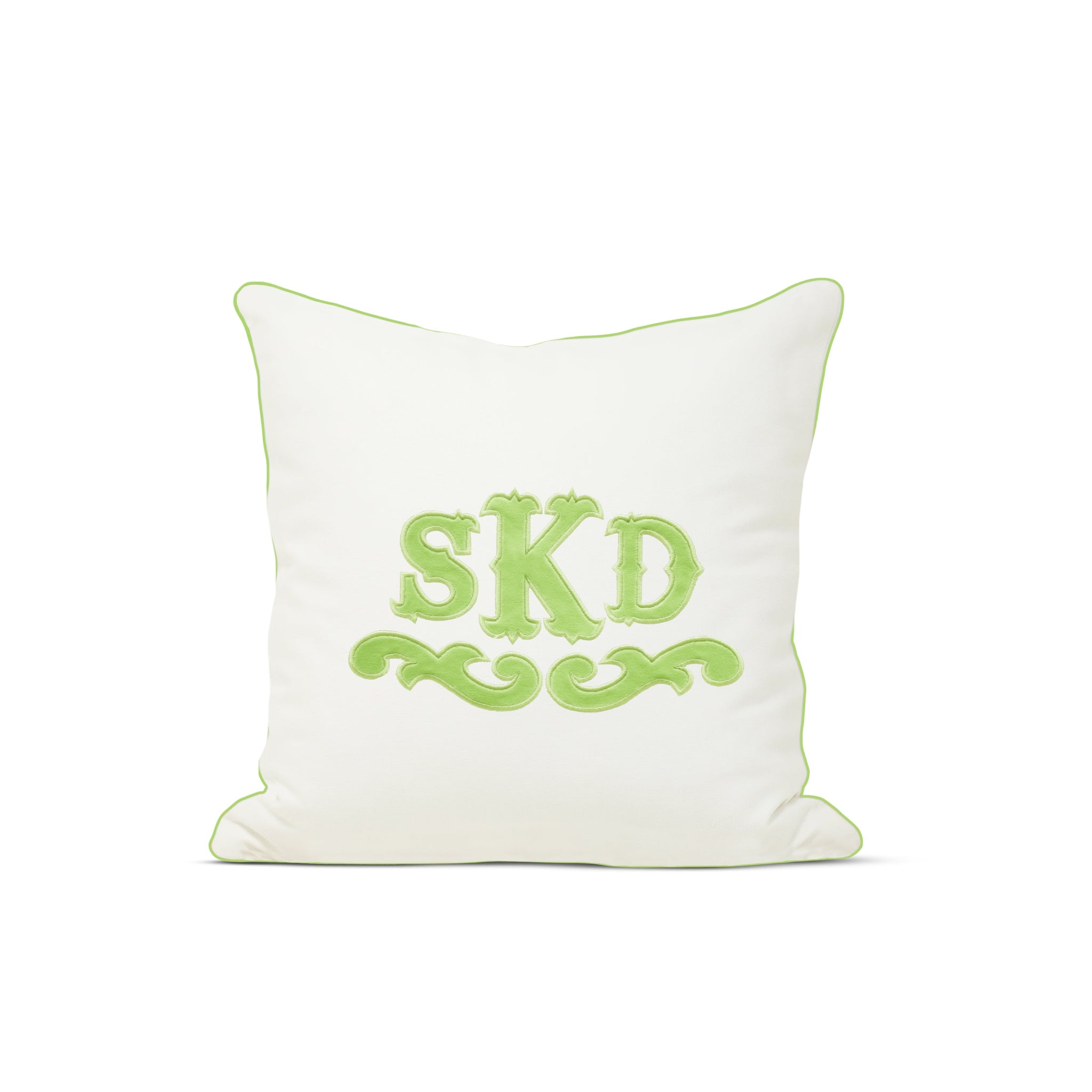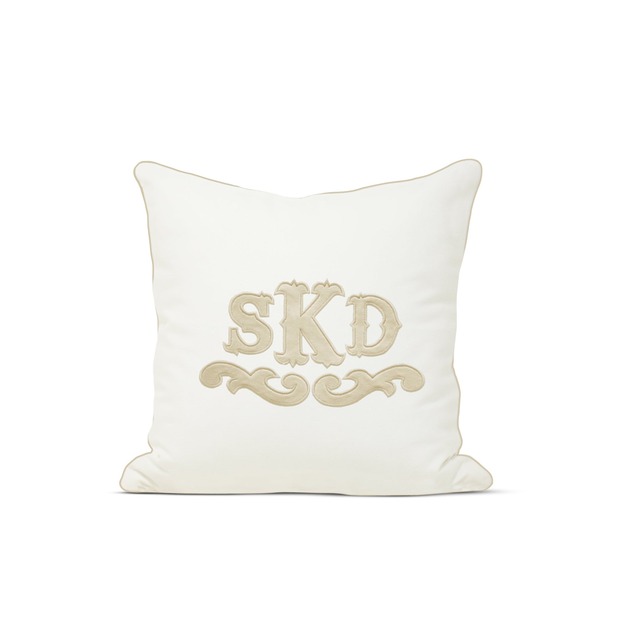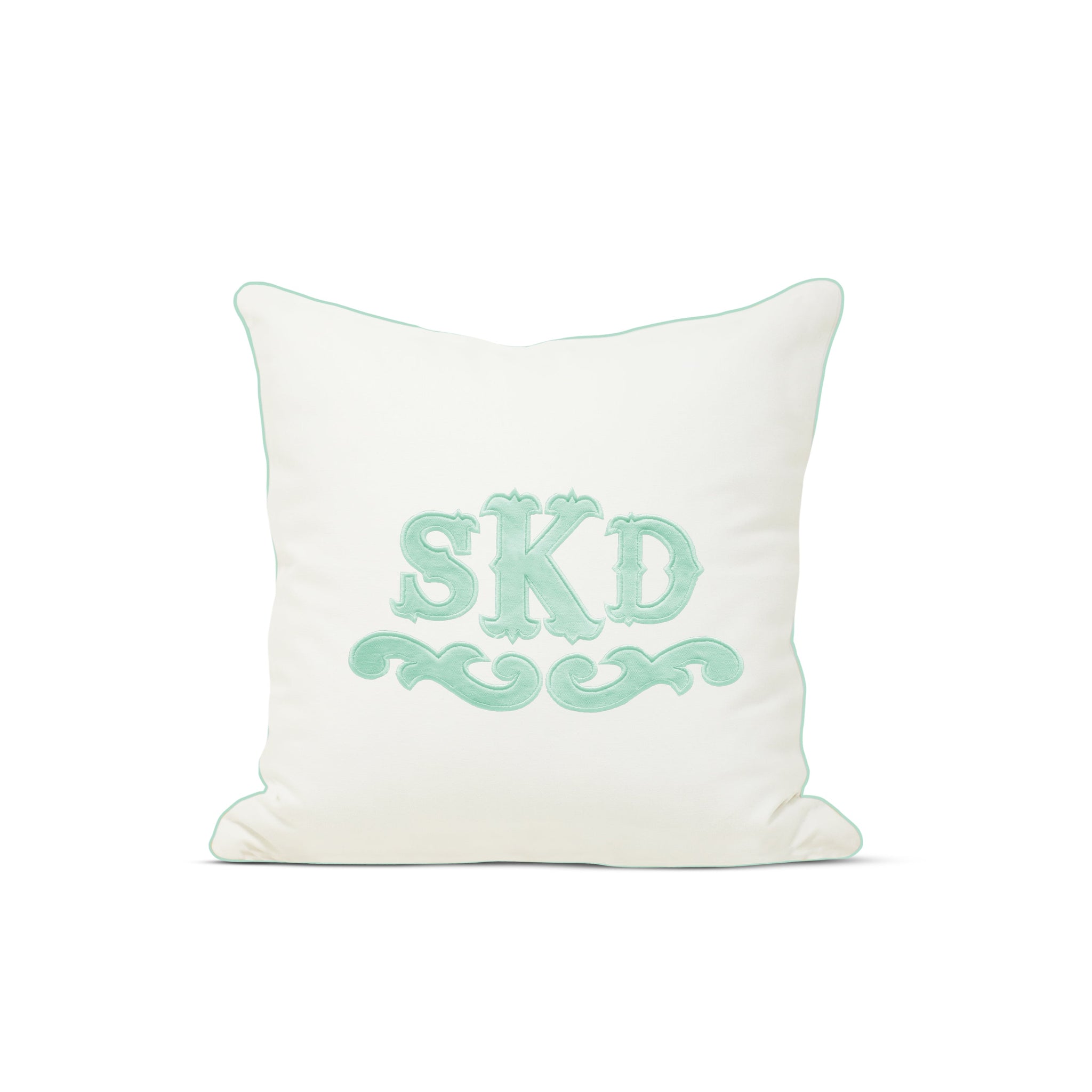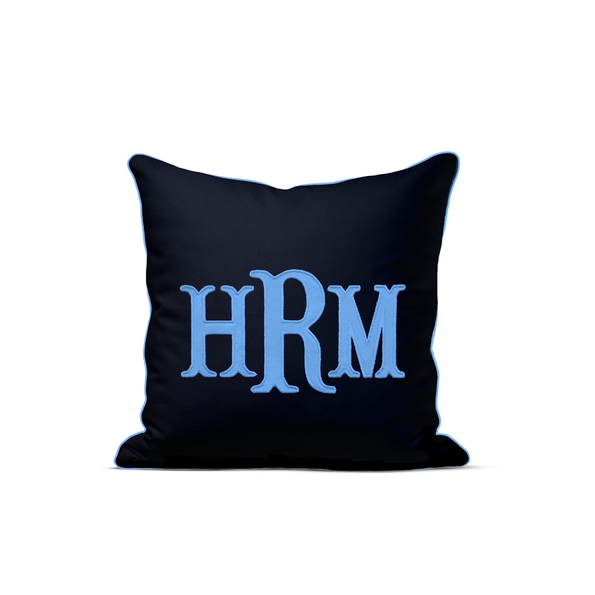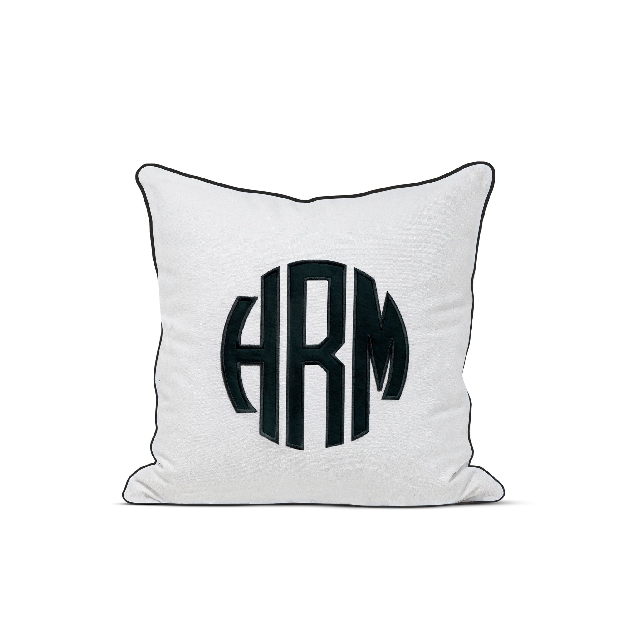 Appliqué monogram pillow cover with welt. The pillow cover fabric is made from soft cotton canvas and the applique and trim is from soft cotton fabric.
