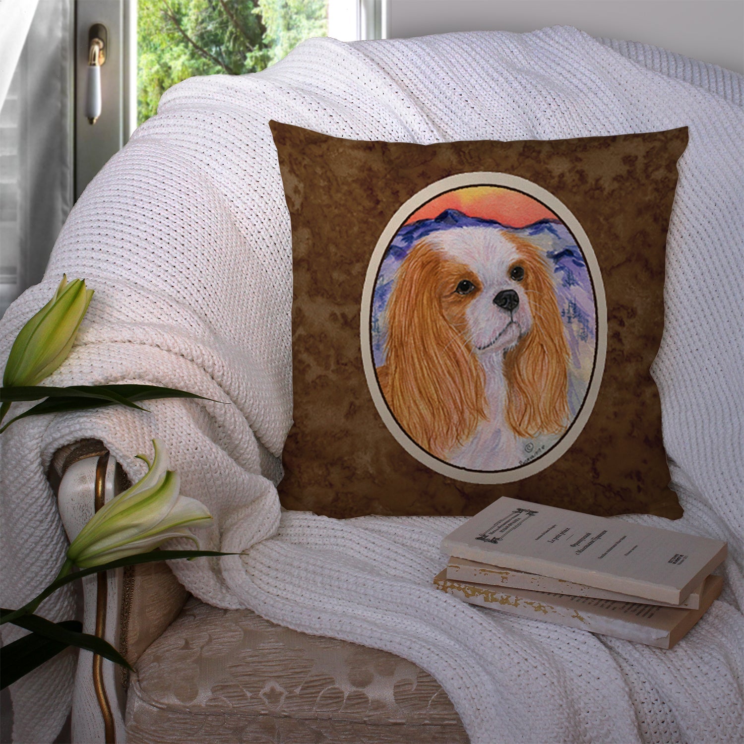 Decorate your space with our Cavalier King Charles Spaniel artwork on a Pillow. Add a touch of vibrancy and comfort to your outdoor seating with Caroline's Treasures Fabric Decorative Pillow. Measuring approximately 14 inches by 14 inches, this outdoor pillow is crafted to elevate the appeal of your patio furniture, infusing it with vivid color and artistic flair. The pillow includes a 100% Polyester Fabric sham filled with a quality pillow form to provide superior comfort. Innovatively made from our brand new material, specifically woven for its water resistance, this pillow is designed for durability. The soft canvas fabric offers versatility in use, fit for your indoor couch or your outdoor patio, porch, or veranda. The fabric is dyed with colorfast dyes built for resilience against weather conditions, ensuring the pillow retains its beauty over time. Constructed by sewing three fabric pieces to create a sham, the polyester insert is then nestled inside to form the pillow, resulting in an overstuffed pillow that maintains its shape. Both the sham and the pillow insert are proudly made in the United States. As the pillows are handcrafted, there may be minor variations in size, further enhancing their unique charm. Experience comfort in style with Caroline's Treasures Fabric Decorative Pillow.