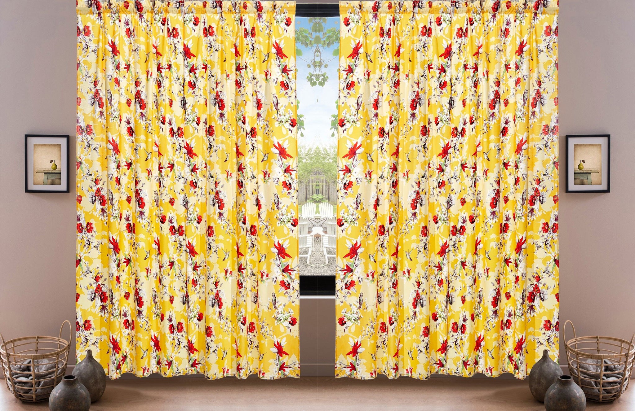 Set of 2 Yellow Semi Sheer Curtain Panels that are accented with floral hummingbird patterns with hints of red, grey, green, and a vibrant yellow shades.