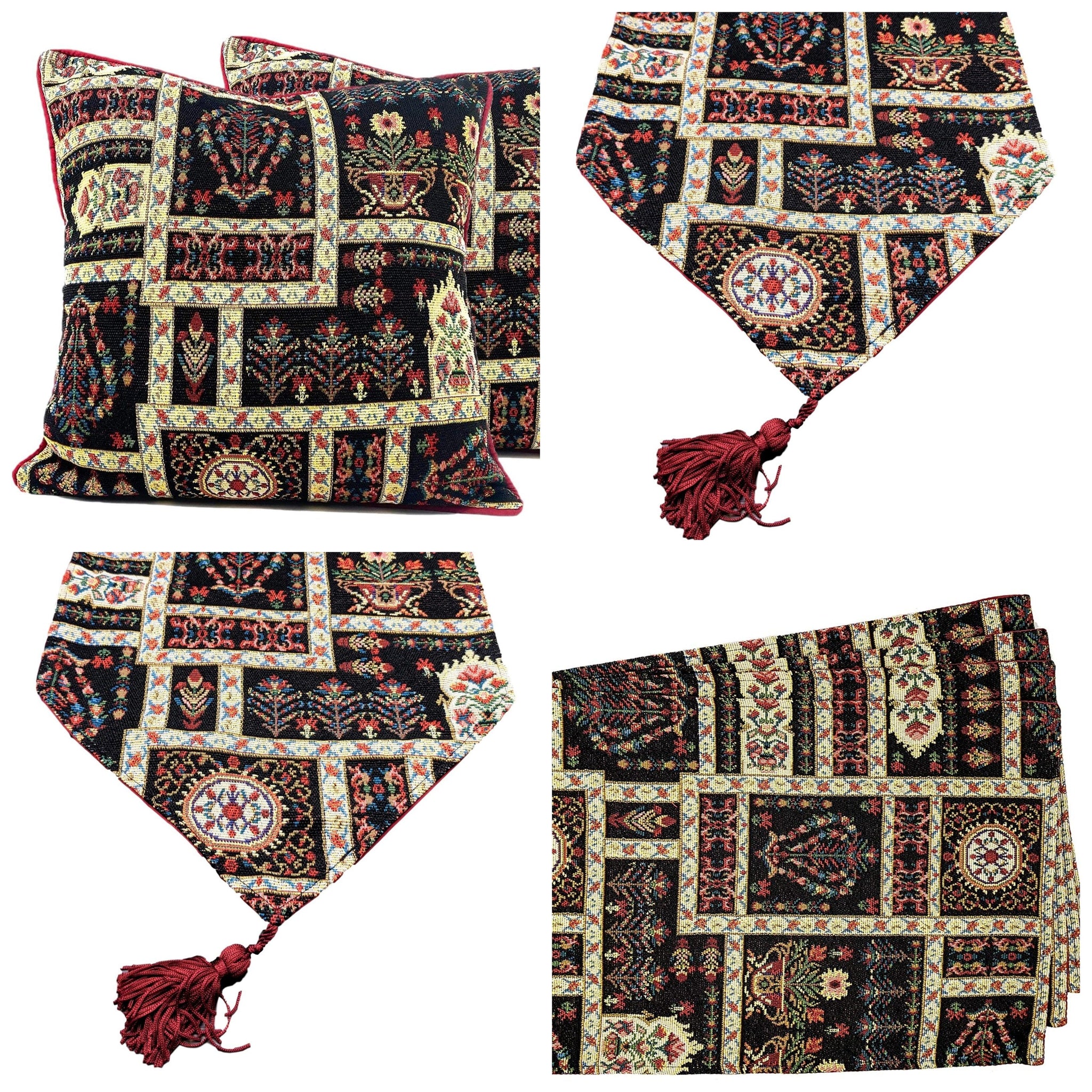 DaDa Bedding Set of 8 Pieces Dark Botanical Mughal Floral Table Woven Black Tapestry - 4 Placemats, 2 Table Runners, 2 Throw Pillow Covers (18197)