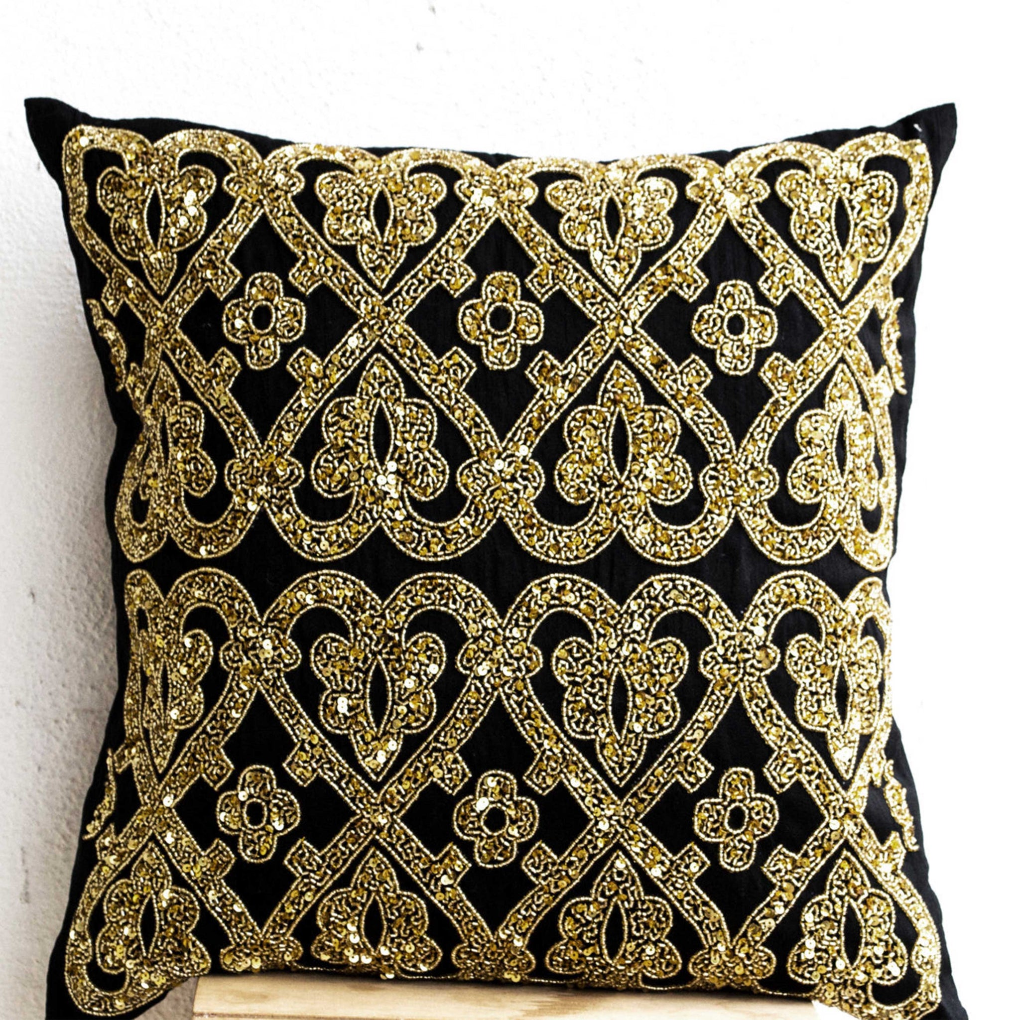 Black faux silk throw pillows with bead sequins detail. Gold pillow inspired by the glamour and sumptuous patterns loved by Maharajahs. This toss pillow can be used to accent a neutral sofa and teams well with contrasting colors.