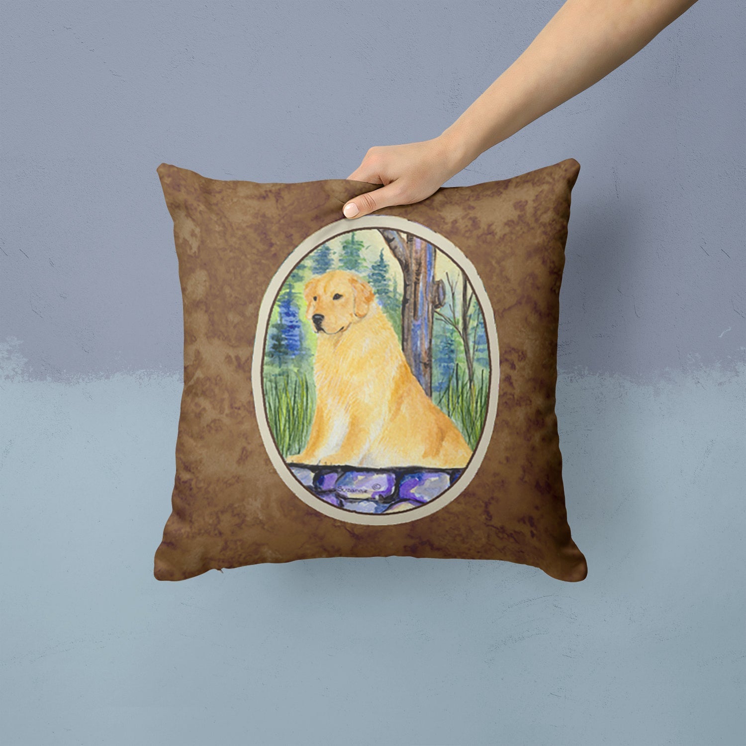 Decorate your space with our Golden Retriever artwork on a Pillow. Add a touch of vibrancy and comfort to your outdoor seating with Caroline's Treasures Fabric Decorative Pillow. Measuring approximately 14 inches by 14 inches, this outdoor pillow is crafted to elevate the appeal of your patio furniture, infusing it with vivid color and artistic flair. The pillow includes a 100% Polyester Fabric sham filled with a quality pillow form to provide superior comfort. Innovatively made from our brand new material, specifically woven for its water resistance, this pillow is designed for durability. The soft canvas fabric offers versatility in use, fit for your indoor couch or your outdoor patio, porch, or veranda. The fabric is dyed with colorfast dyes built for resilience against weather conditions, ensuring the pillow retains its beauty over time. Constructed by sewing three fabric pieces to create a sham, the polyester insert is then nestled inside to form the pillow, resulting in an overstuffed pillow that maintains its shape. Both the sham and the pillow insert are proudly made in the United States. As the pillows are handcrafted, there may be minor variations in size, further enhancing their unique charm. Experience comfort in style with Caroline's Treasures Fabric Decorative Pillow.