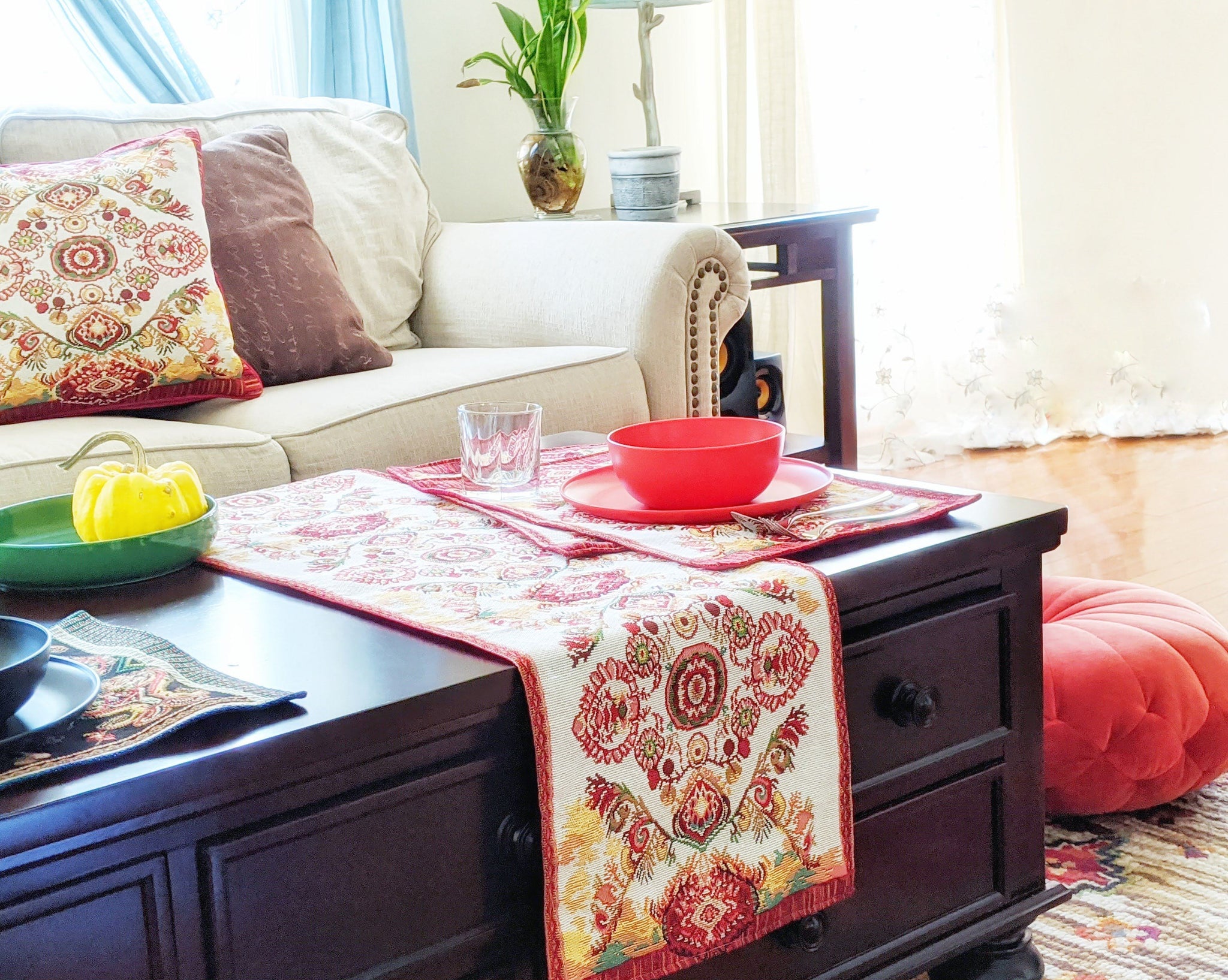 - The back of the dinner table mat is a solid burgundy fabric