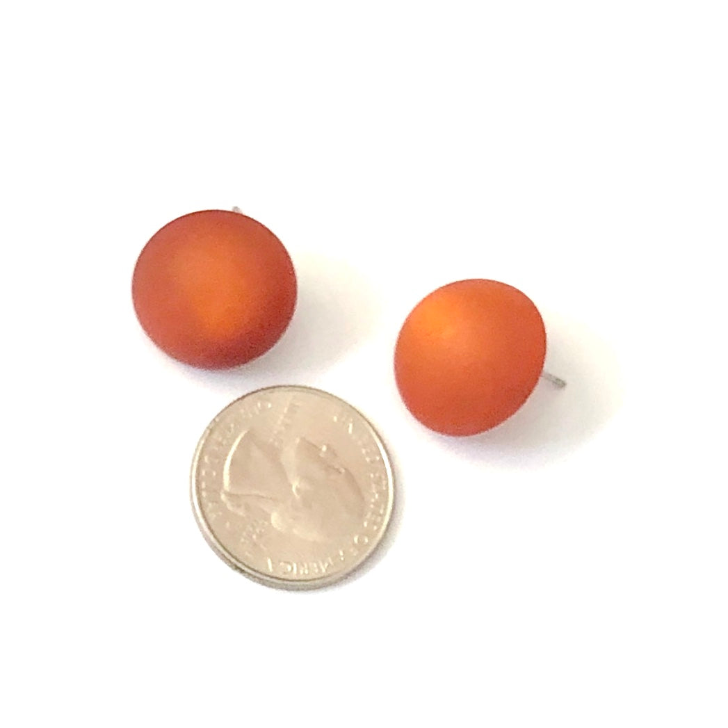 Orange frosted stud earrings with a fantastic moonglow finish. These are part of the 'Retro Button Stud' style & they come in loads of different sizes & colors. This size measures just under 3/4" or 18mm in diameter. The model is wearing this earring in the "Blue Agate" color so you can get an idea of size & scale when worn.