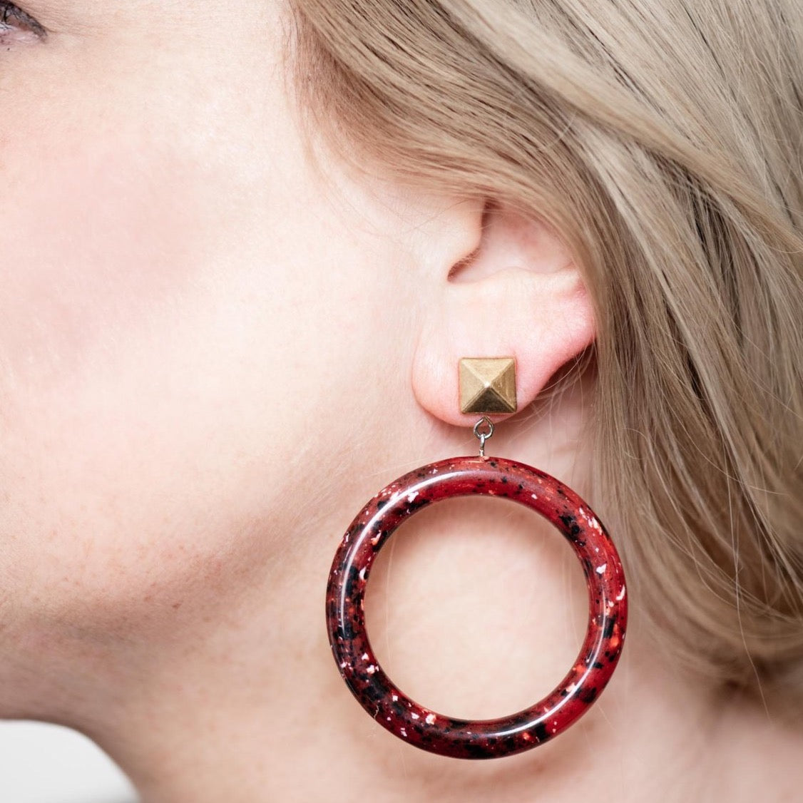 Metallic brass nailhead studs meet deep red granite speckled go go style donut style hoops. The stud measures about 10mm and the entire earring is just under 3" in length 2" in width and super light weight.