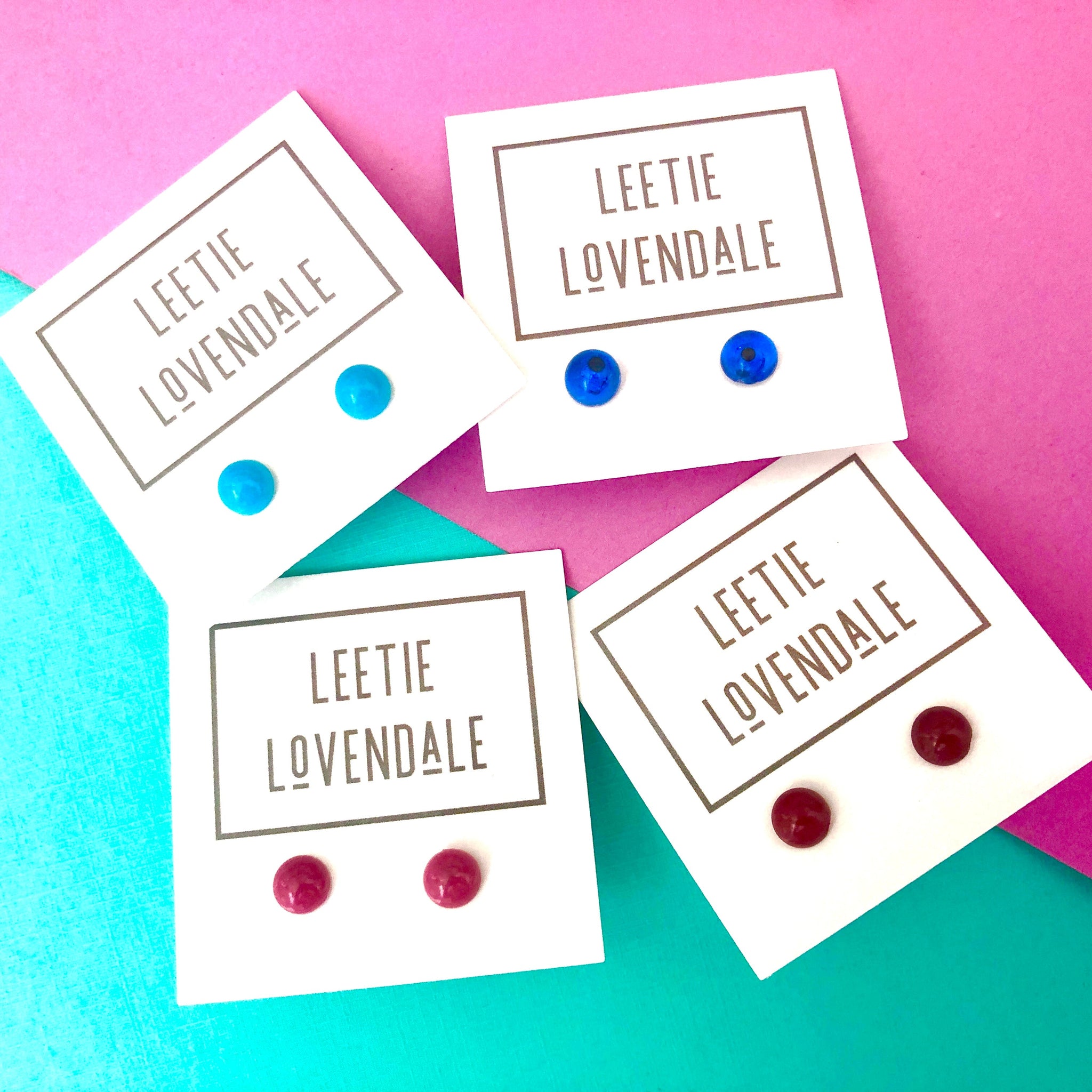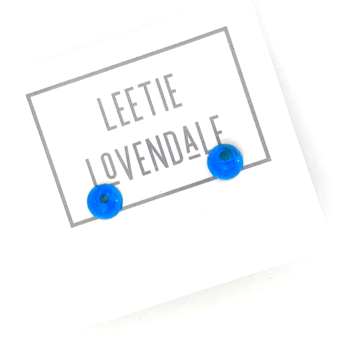 Bright sapphire blue stud earrings in a minimalist size and a glass like finish. This style is known as the 'Retro Button Stud' earring & comes in loads of colors & sizes. Each stud earring measures 6mm and gives the perfect pop of color.