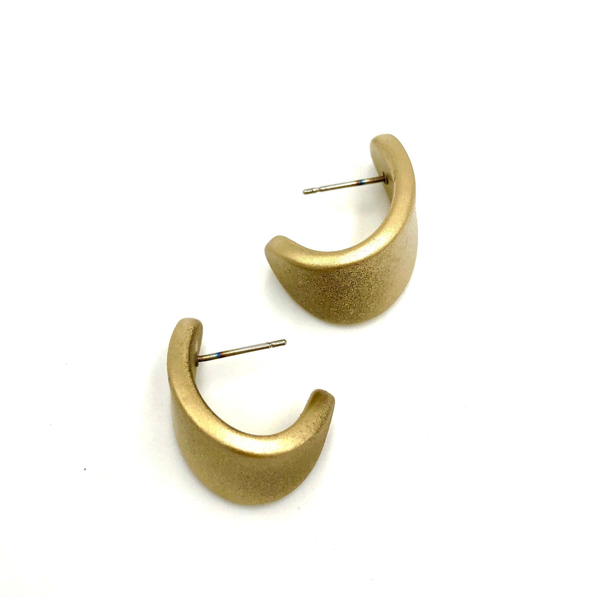 Metallic enameled gold earrings on curled, petal-shaped stud shapes, each measuring 16x24mm.