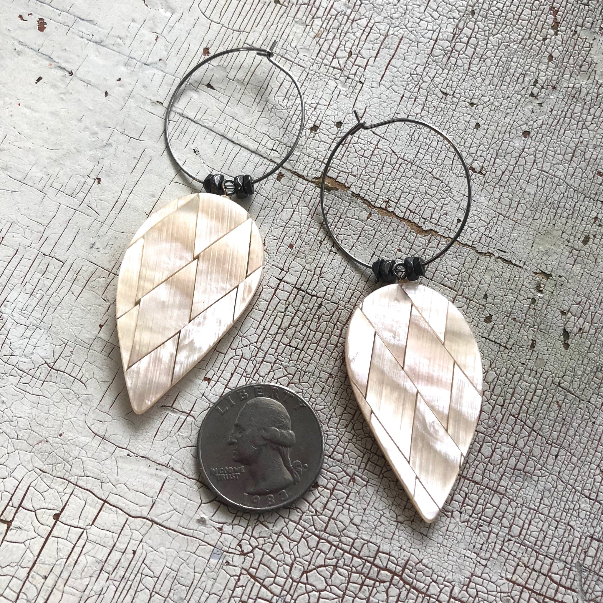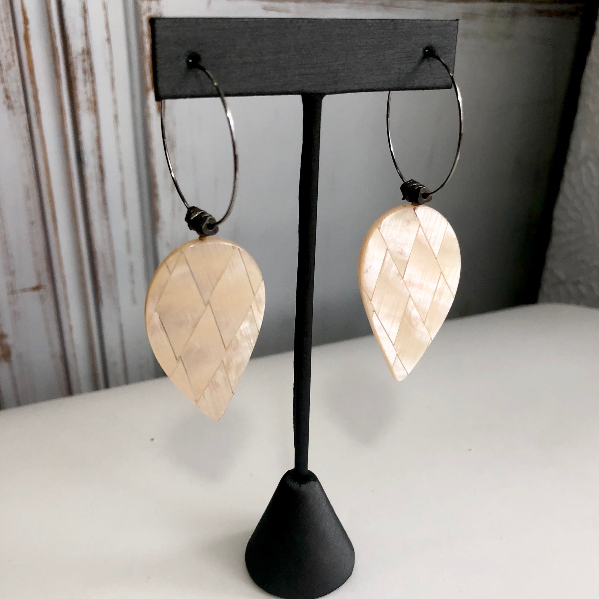 Shell colored quilted resin with hints of gold, but made with vintage resin. These upside-down drops hang from hoop earrings in a great size & a gun metal finish. These fun statement earrings are light-weight & fun to wear and make a sweet statement.