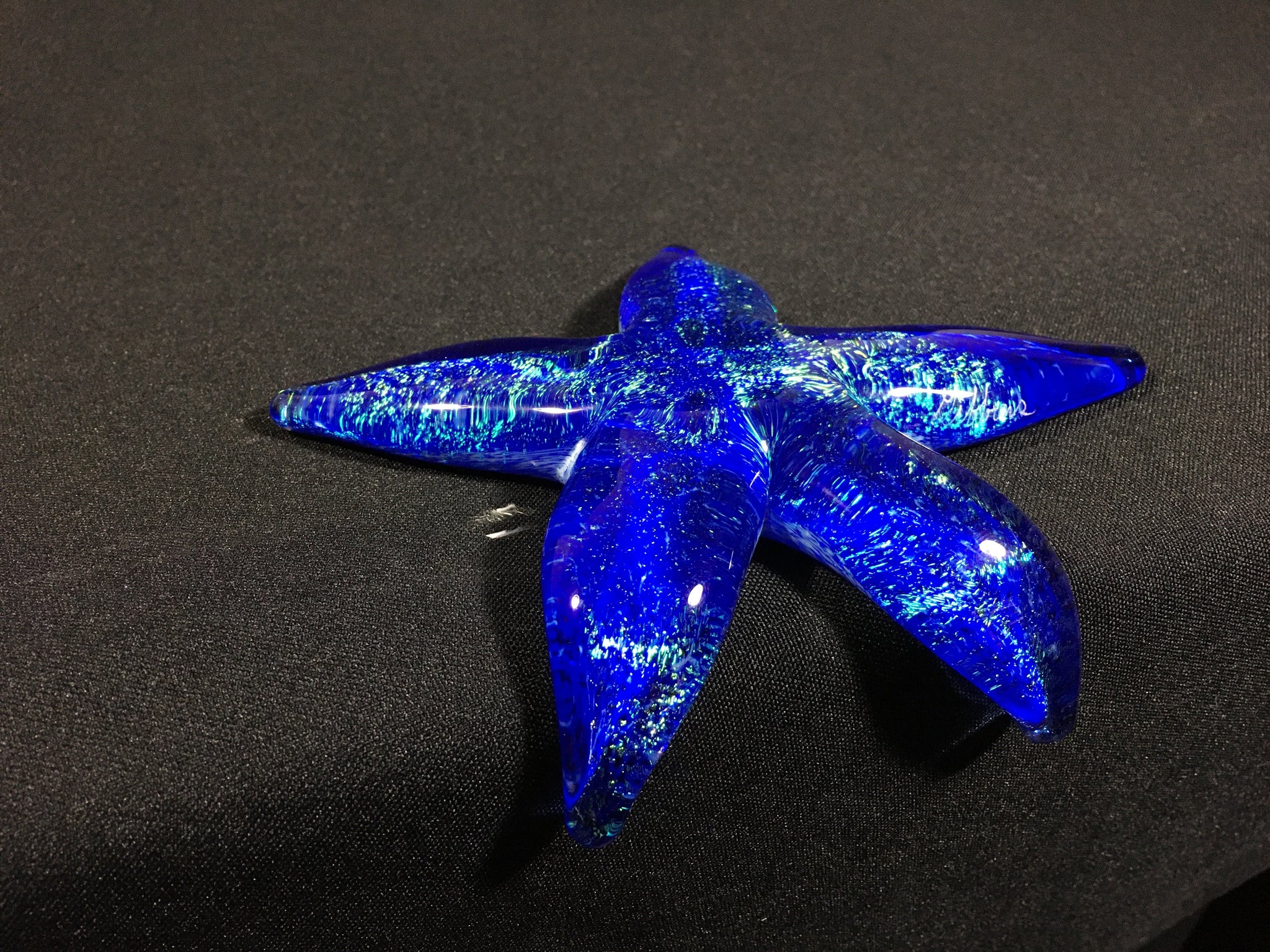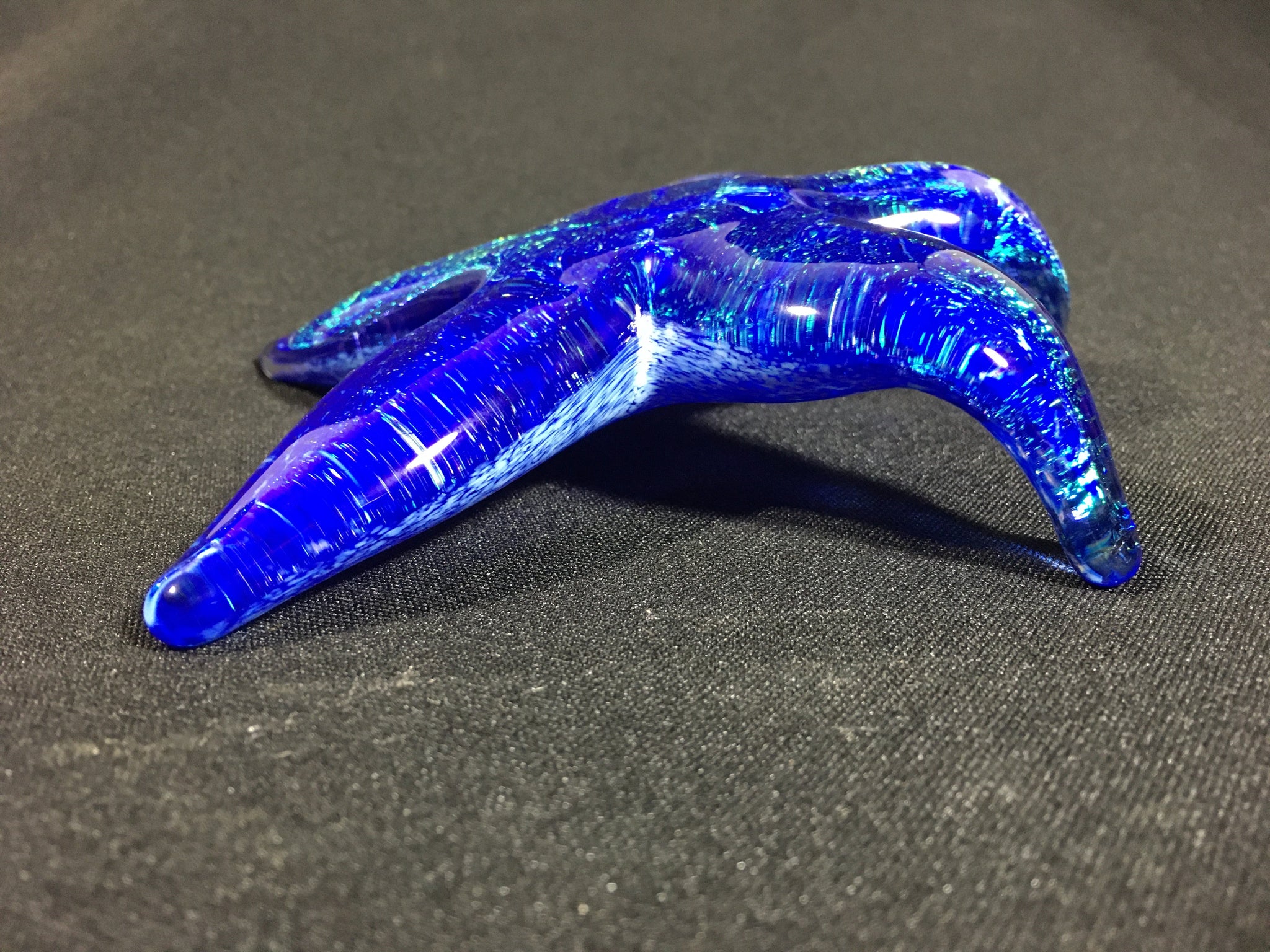 Hand sculpted glass starfish. This Shimmering Ocean Starfish is created by adding a thin layer of dichroic glass to a cobalt blue and white color pattern. Dichroic glass is metallic and glitter-like, giving the appearance of shimmering sand, appearing and disappearing in the light. This adds another dimension to the glass starfish.