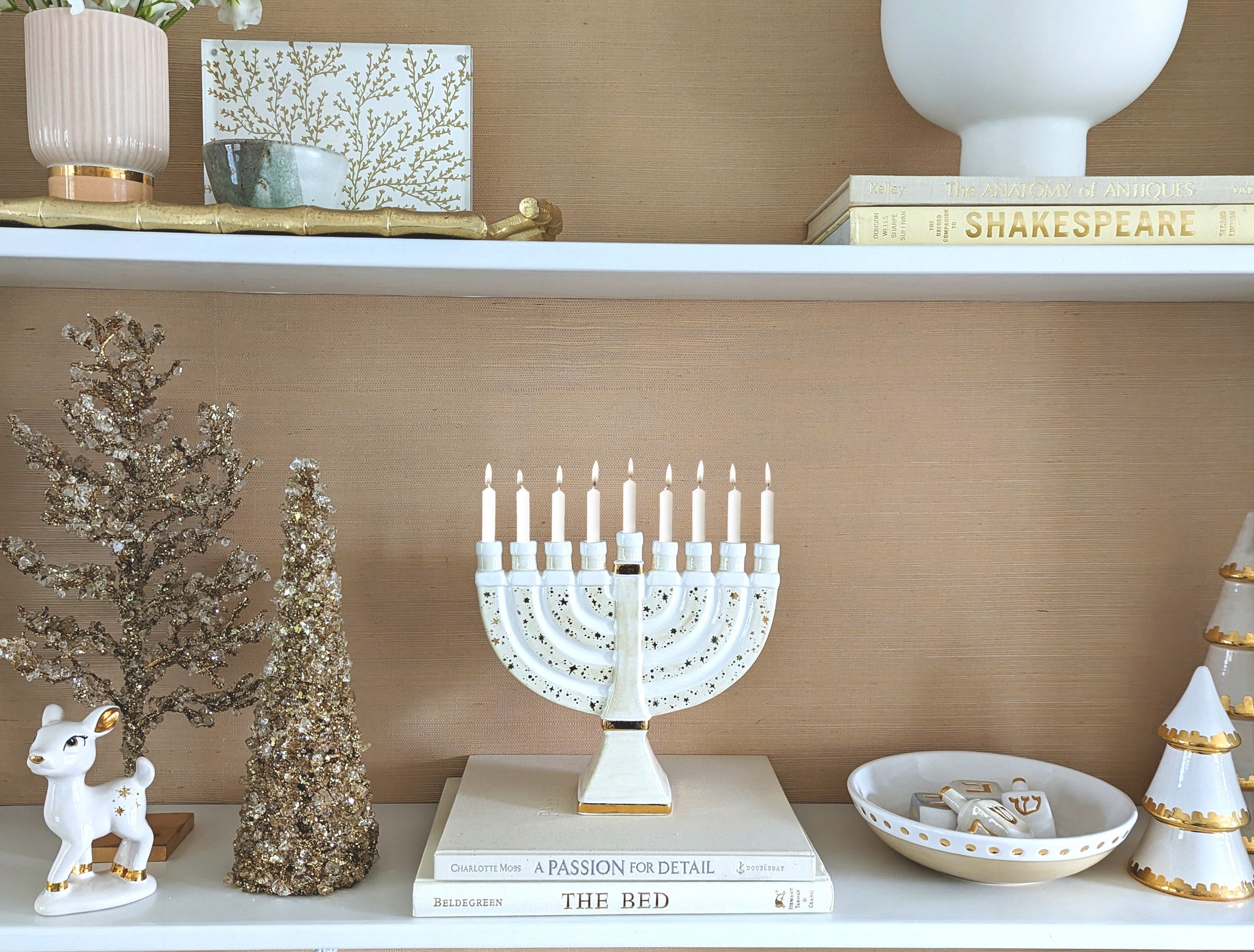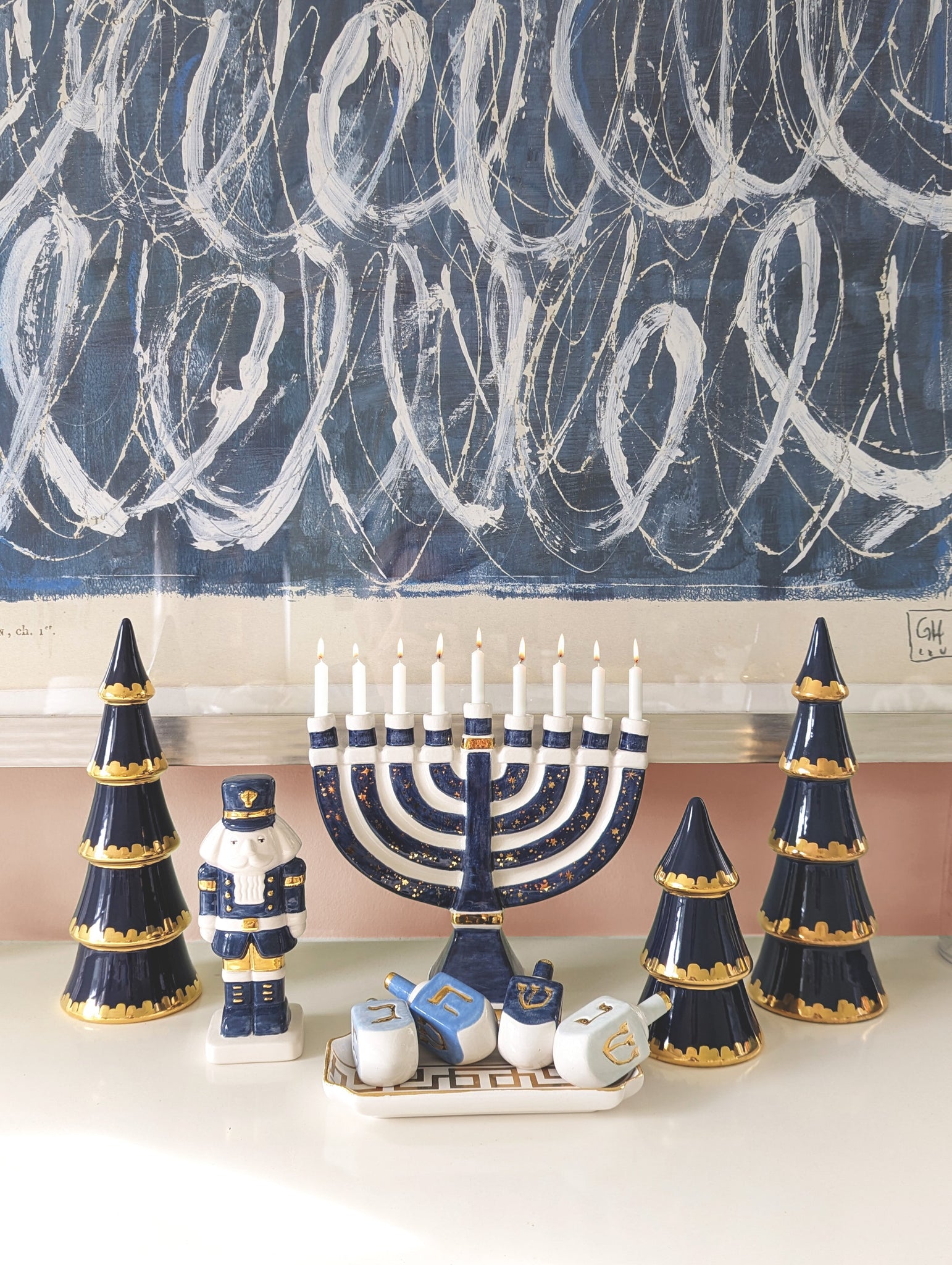 This Menorah perfectly combines traditional and fresh elements for a stunning, shimmering piece that will surely become a treasured heirloom. This hand-crafted menorah is adorned with 22K gold stars applied with love by our talented artisans. Each piece is a unique and one-of-a-kind work of art.