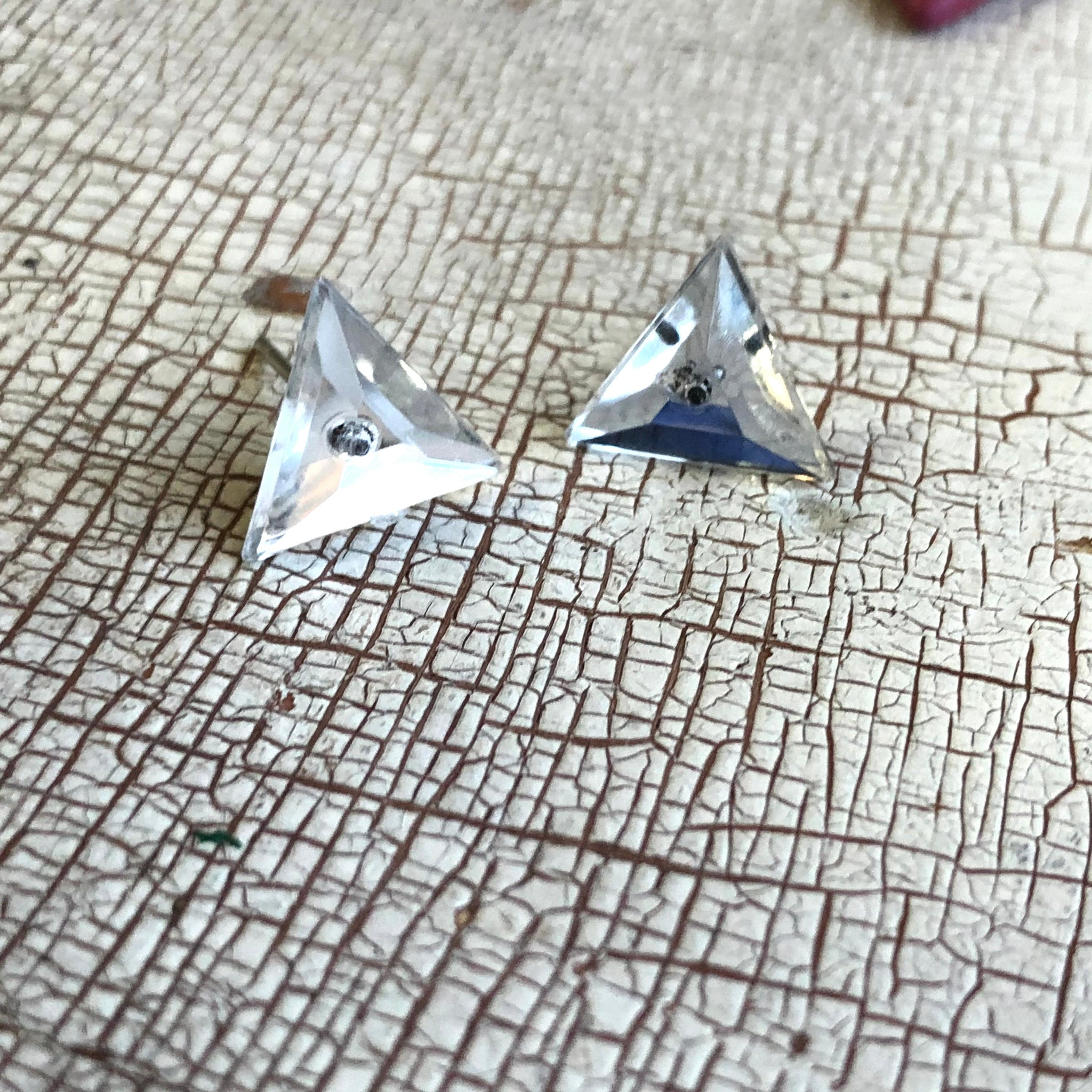Clear crystal silver stud earrings in a faceted triangle or pyramid shape. Each earring measures about 3/4" or 18mm in size. Geometric stud earrings meet minimalist style and retro meets modern.