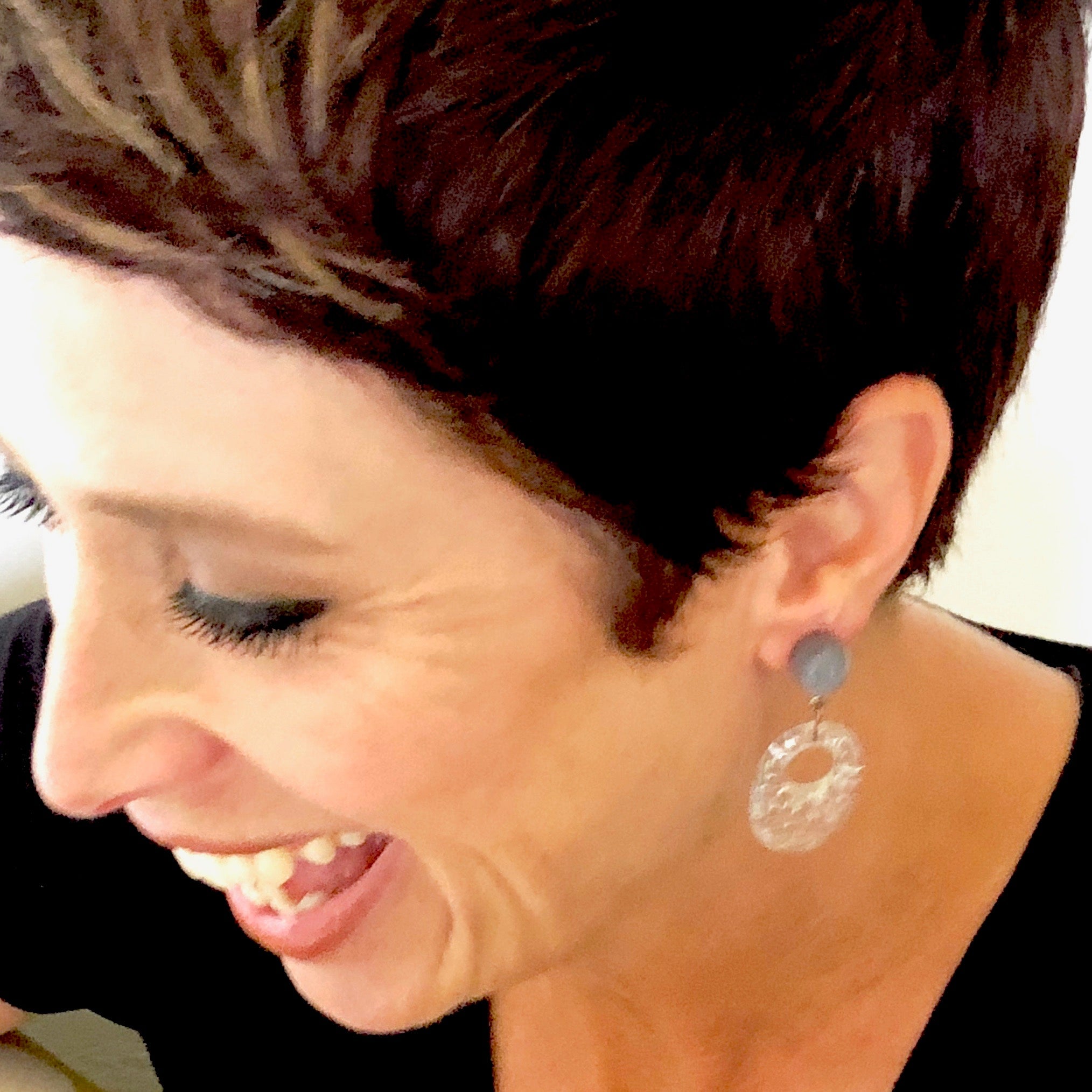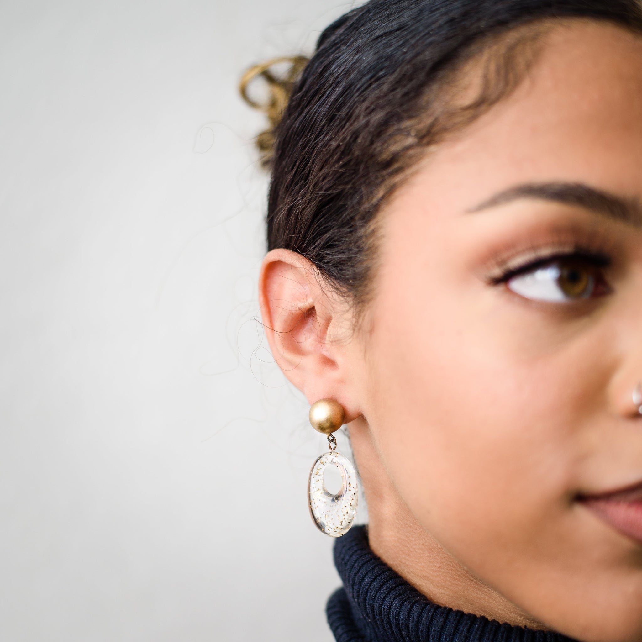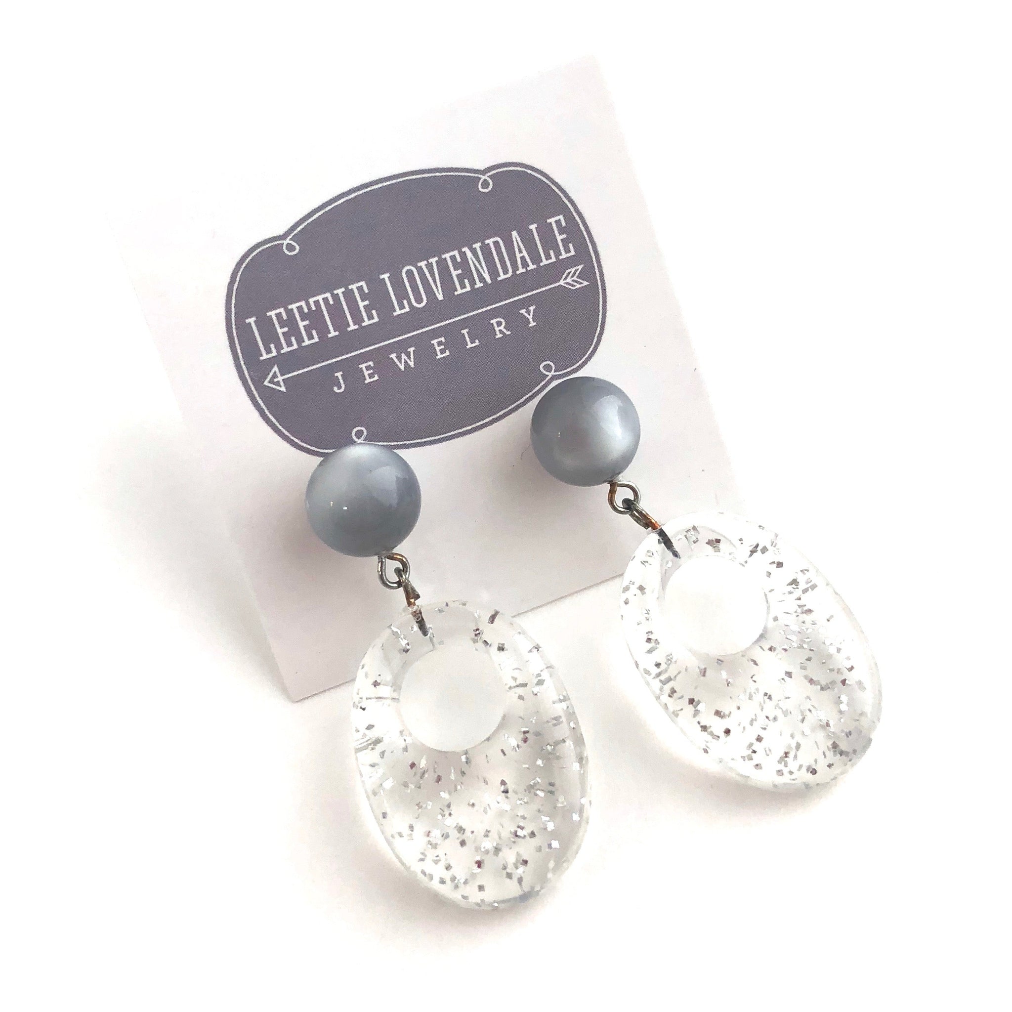 Soft grey stud earrings with a moonglow finish, meet resin Go Go Oval Hoops filled with silver glitter. Let's bring on the bling & glitz of the 70's glam era. The Abba Earrings feature vintage lucite stud earrings set with surgical steel posts.  Each stud earring measures about 1.75" in length & the stud itself is 10mm in diameter.