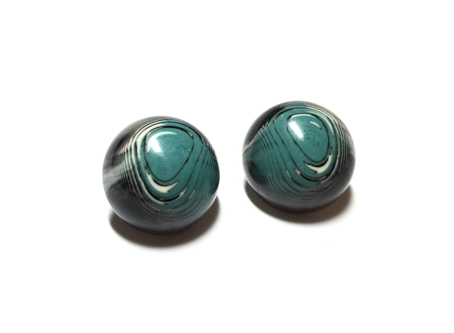 Slate blue and black stud earrings in a great marbled agate motif. This is the 'Retro Button Stud' style which comes in loads of colors & sizes. Each measures about 3/4" or 20mm in diameter. Because they're lucite, they're not heavy. The model is wearing the same size & style in the Blue Bullseye color. Now on Sale! Reg. retail price $14.