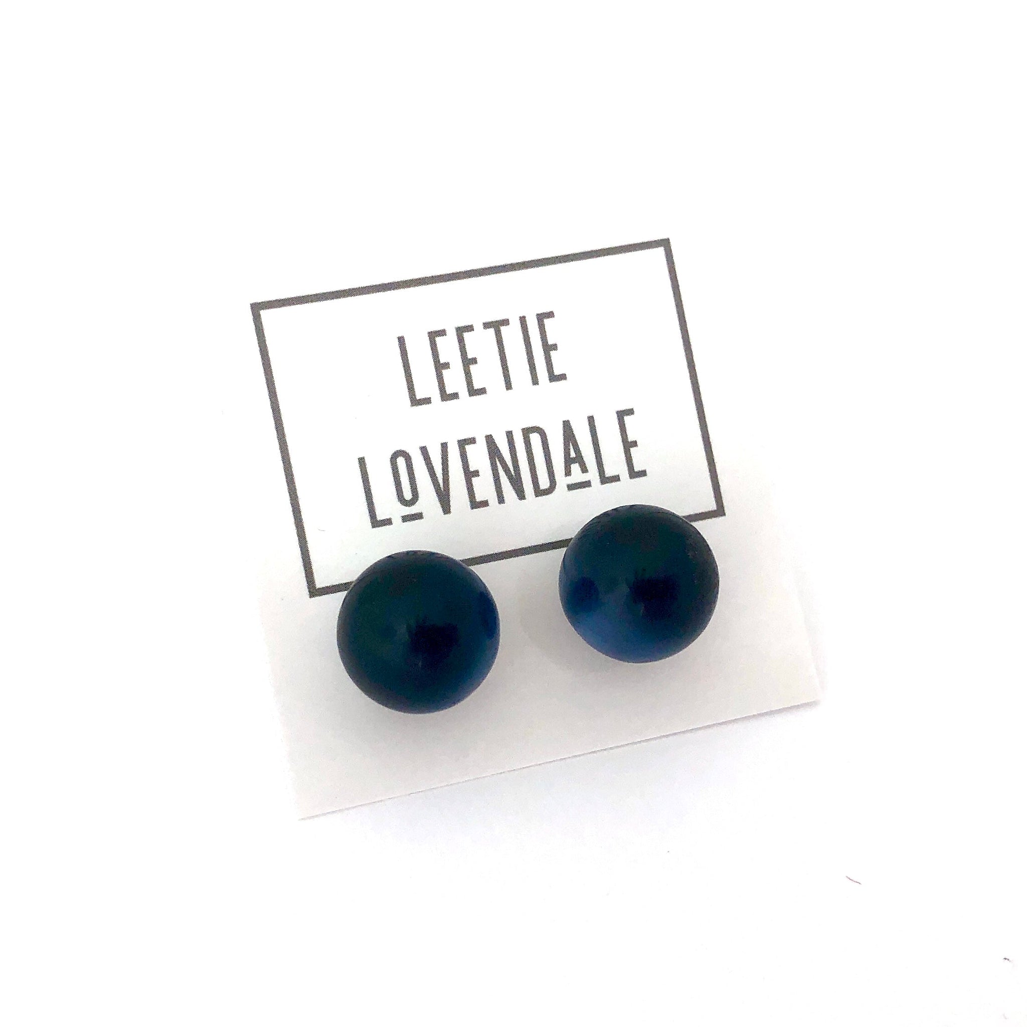 Slate blue studs in a beautiful moonglow lucite bead shaped post earring. Each measures about 14mm diameter. Check out the pic with the model who is sporting the same style & size, in a different blue color. This way you can get an idea of the size & scale when you wear them!