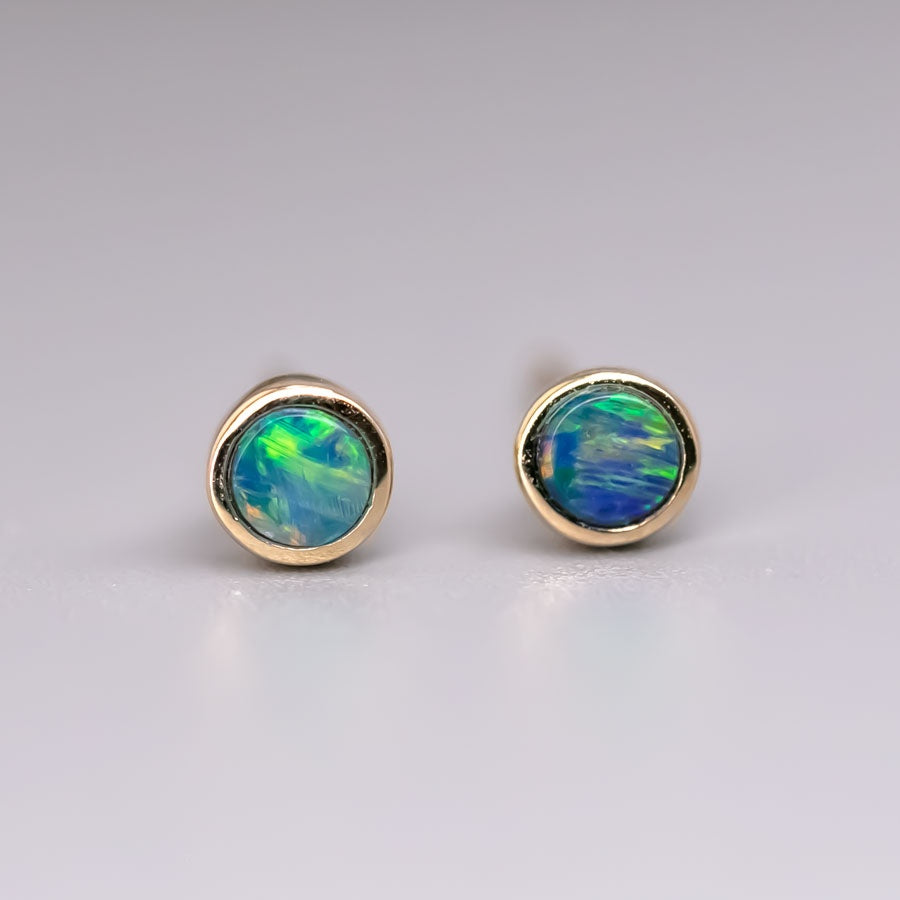 Small Minimalist Round Australian Doublet Opal Stud Earrings 14k Yellow Gold.