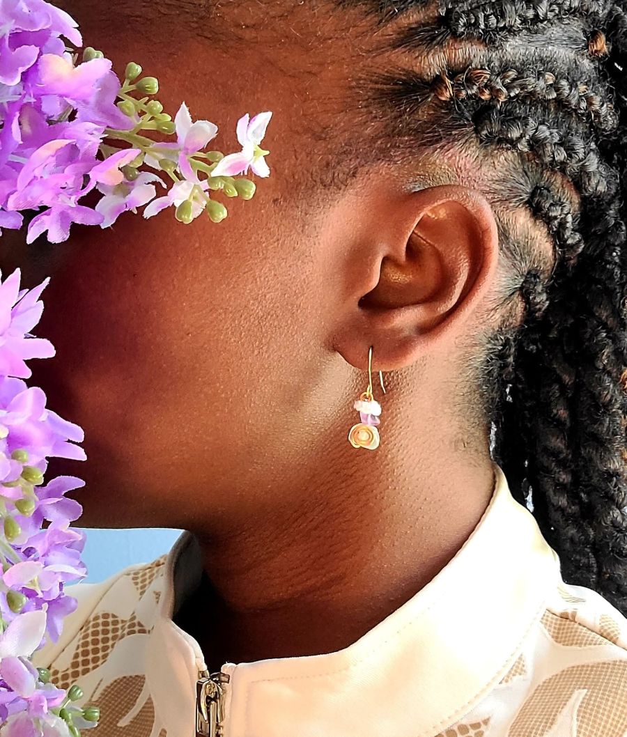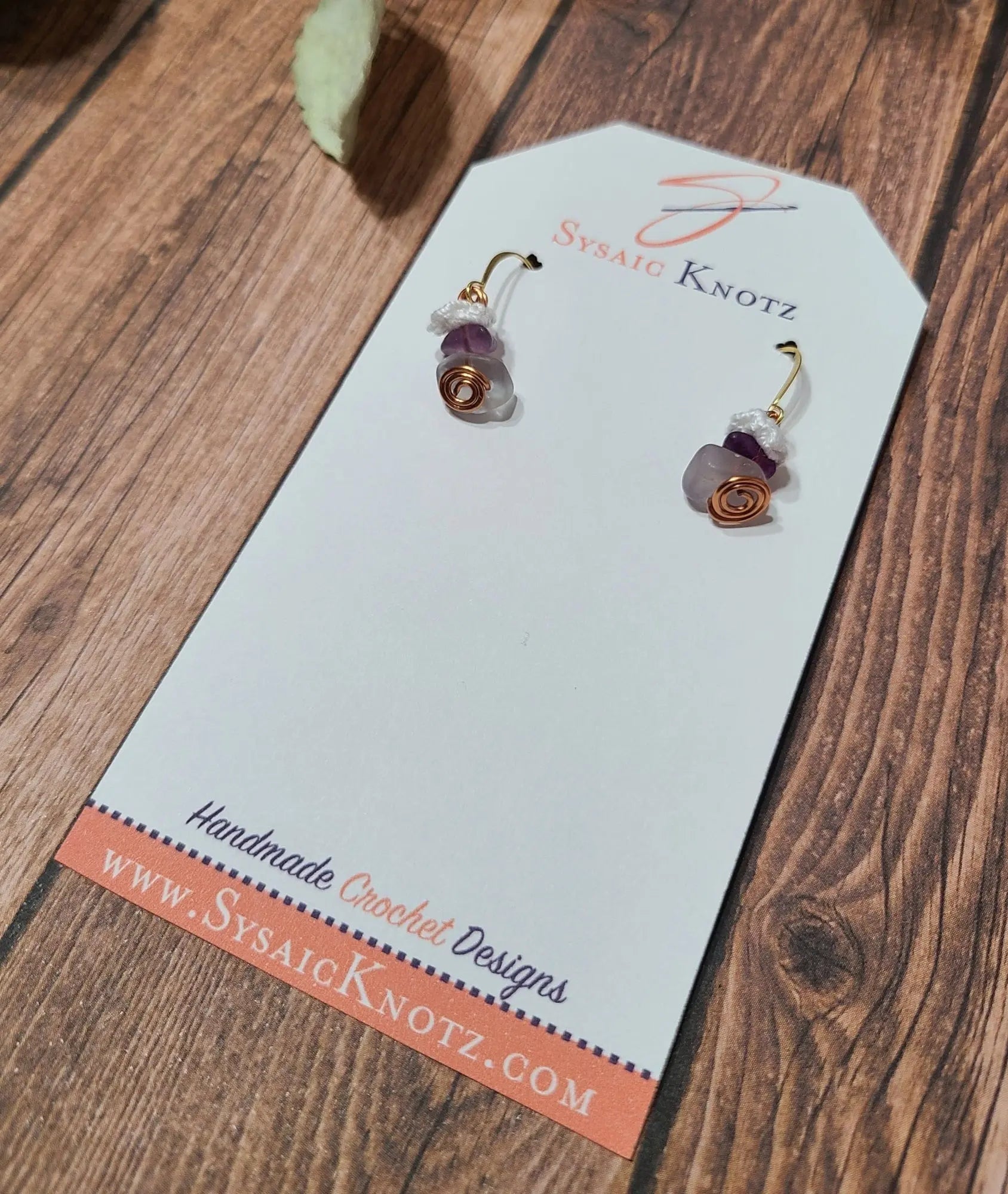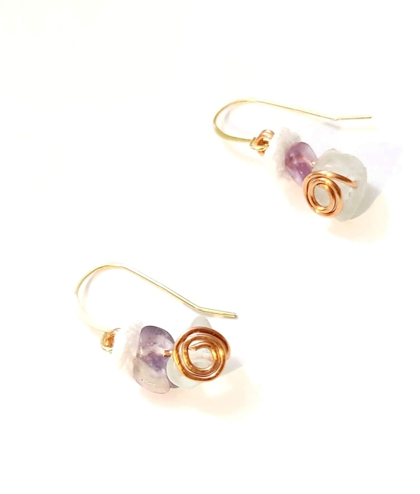 Crystal chunks work so well in this pair of creative earrings! And the lovely Fluorite crystal pairs so well with the copper coiled wire. Now this spiral has been hand wired to create this look and the fluorite crystal has been positioned to showcase the spiral on top of it! These handmade earrings are light weight and finished with a sterling silver plated 14k gold ear wire to treat your ears well. The white circle at the top was also handmade and created by various crochet techniques to complete the look! This pair of spiral fluorite earrings will surely make a statement!