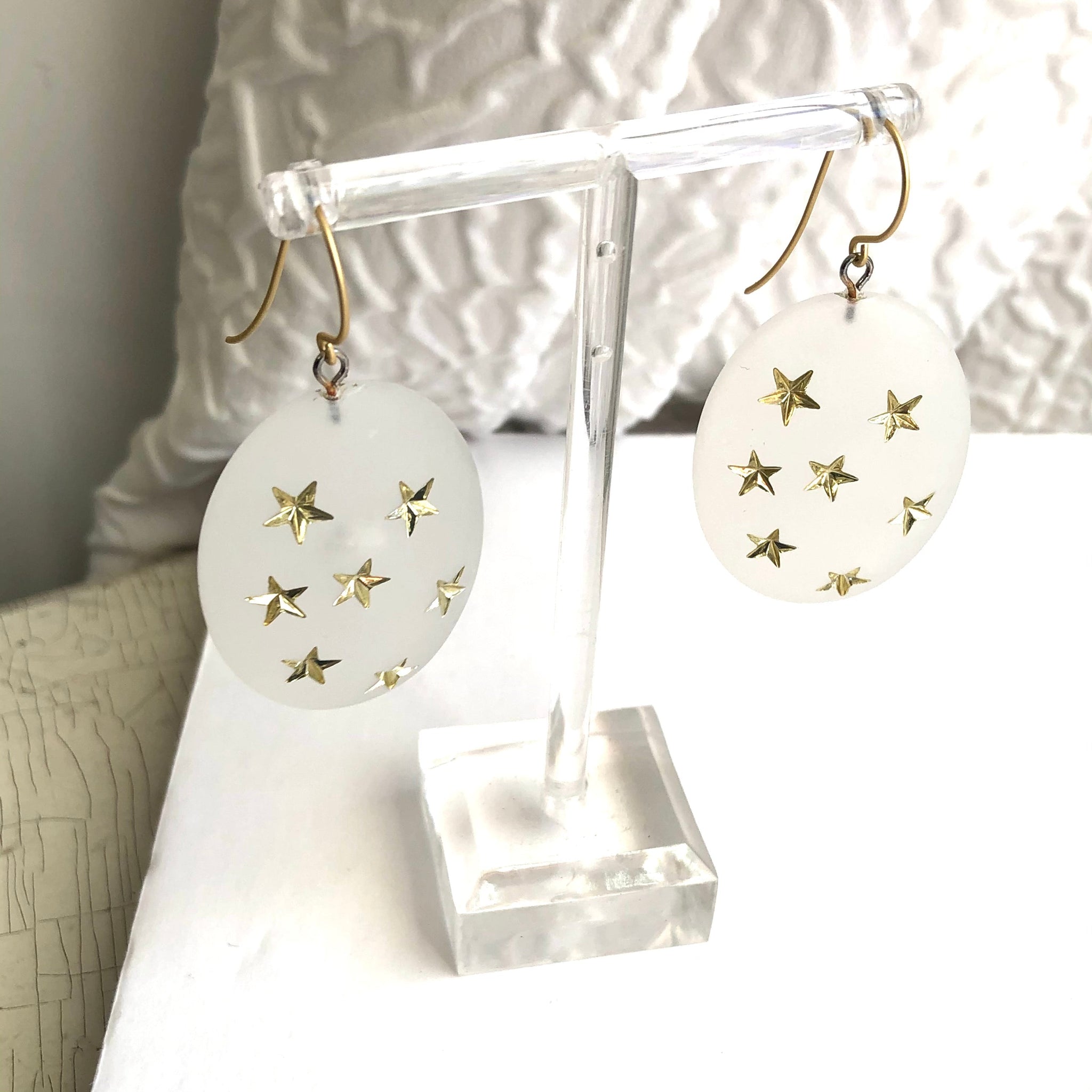 Frosted clear lucite ovals, dotted with gold metallic stars. Each is light weight but makes a statement. Earrings measure about 2.5" from end to end. and just over 1" diameter at the widest point.