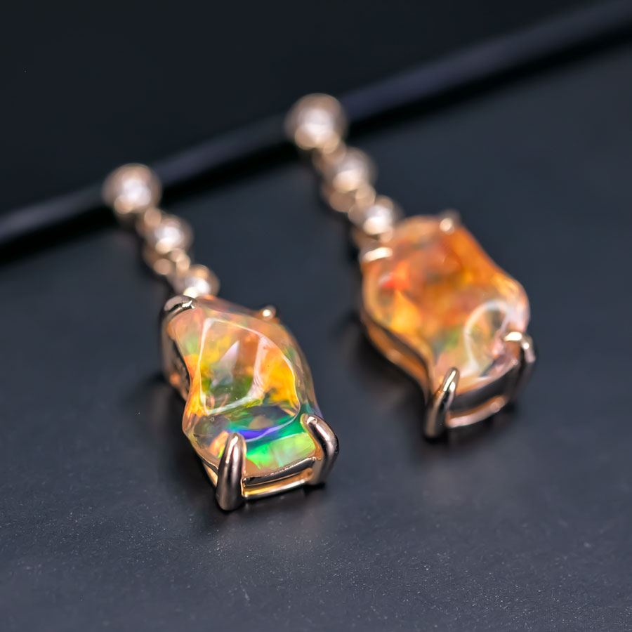 Stunning Diamond Fire Opal Asymmetric Drop Earrings in 18K Yellow Gold