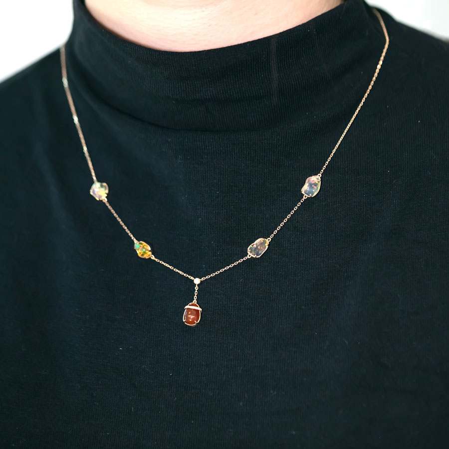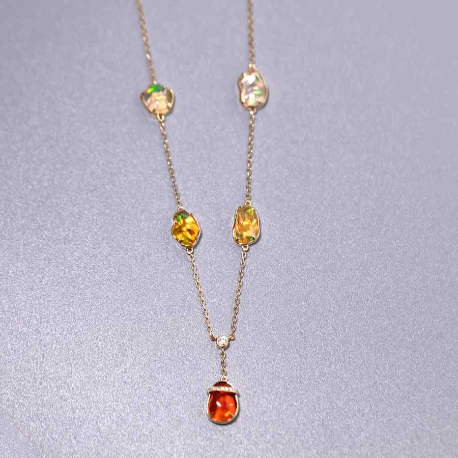 Stylish Five Charms Mexican Fire Opal Diamond Necklace 18K Yellow Gold.