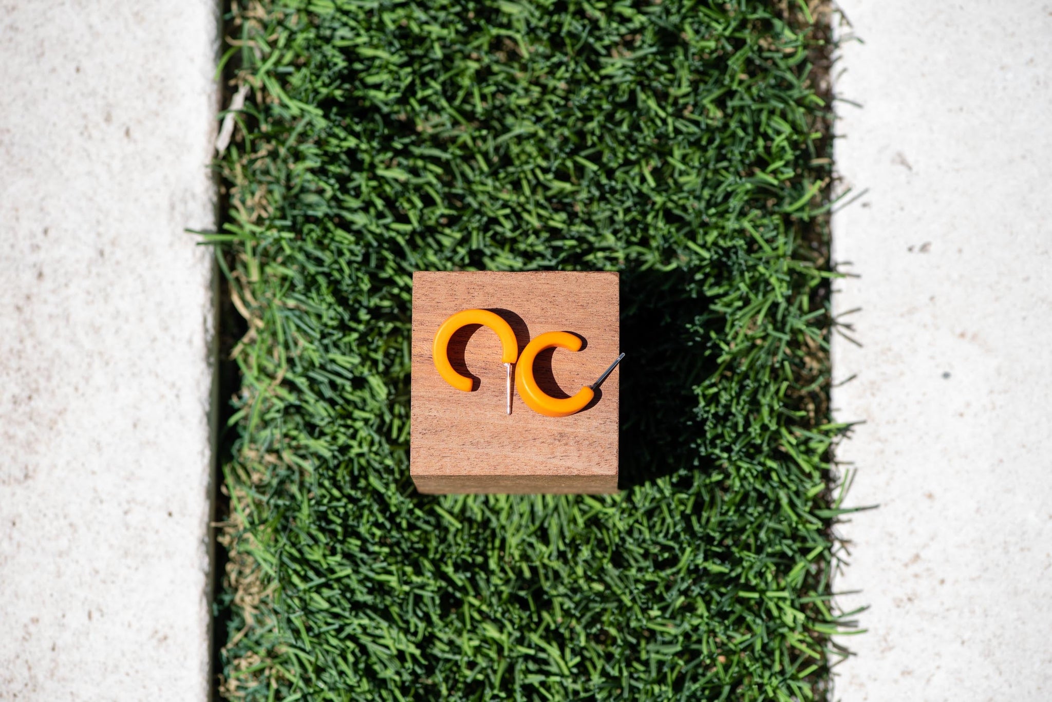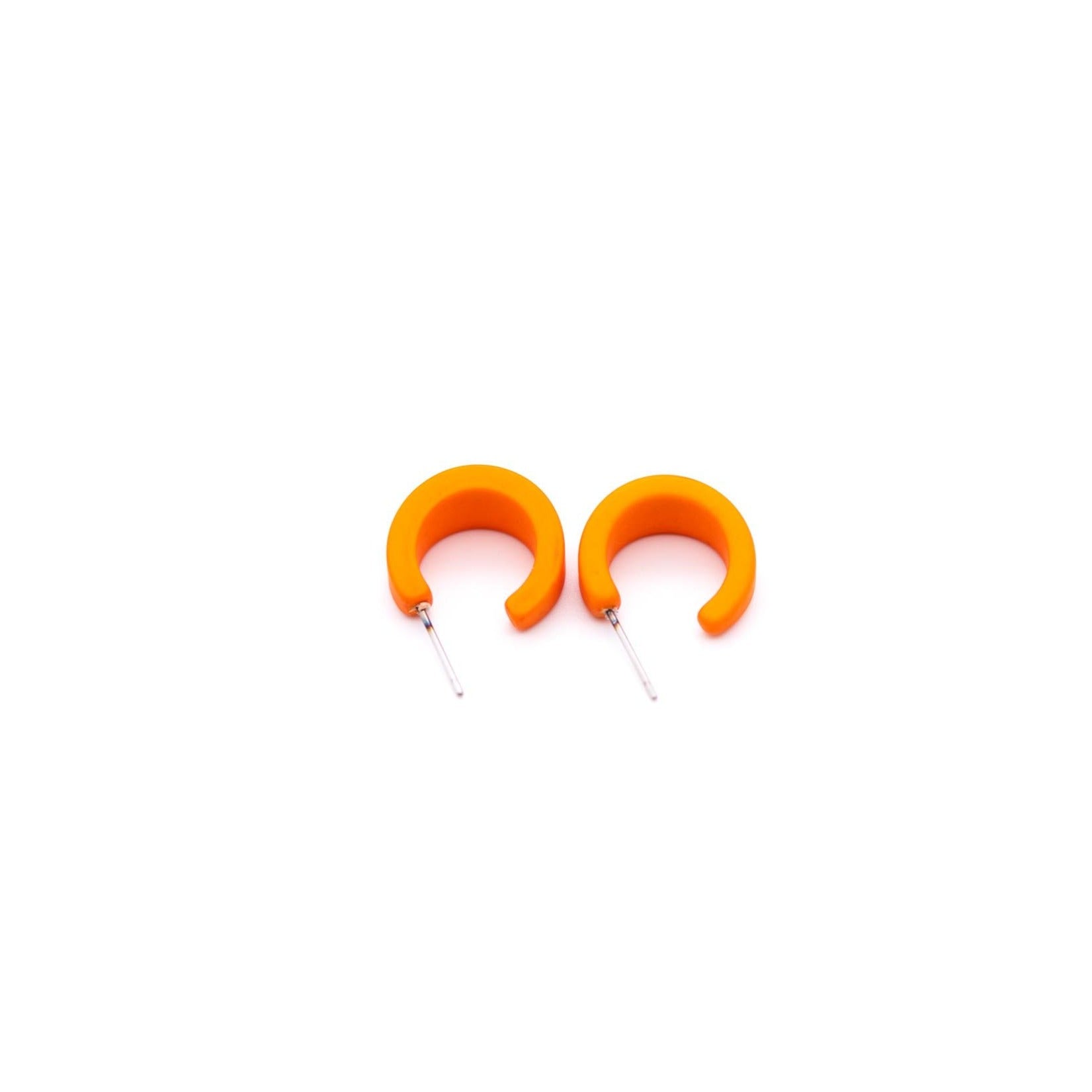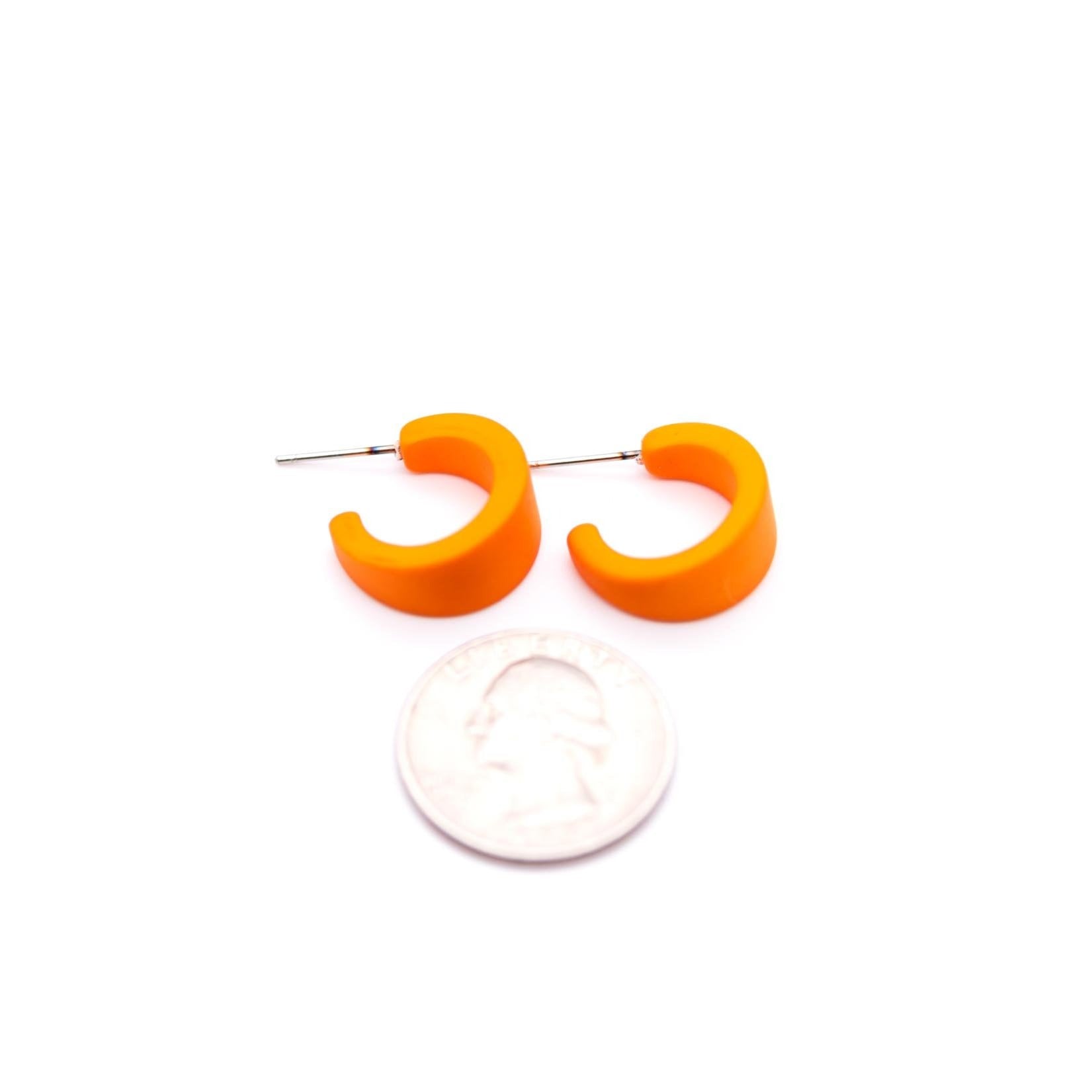 Sun orange tapered hoop earrings in a great petite size. A velvety matte finish. Delicate & lovely. This style is known as the Mini Boom Hoop. Each small tapered hoop measures about 3/4" (19mm) in diameter & 10mm in width at the widest. Smaller than the smallest Marilyn Hoop style.