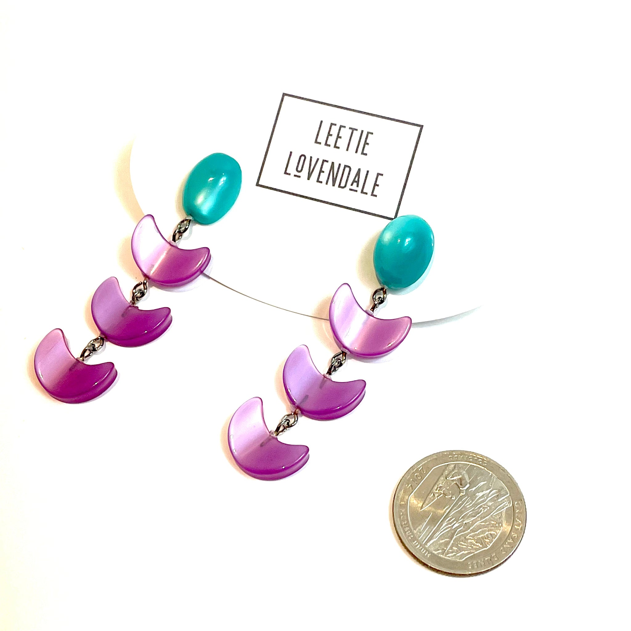 Lilac moonglow fish scale earrings with teal oval studs. Made with 60's vintage moonglow parts & make for a fluid & long statement style. Each earring is set with surgical steel posts & measures about 2" or 60mm & about 16mm at the widest point. The model is wearing the same style earring in another color.