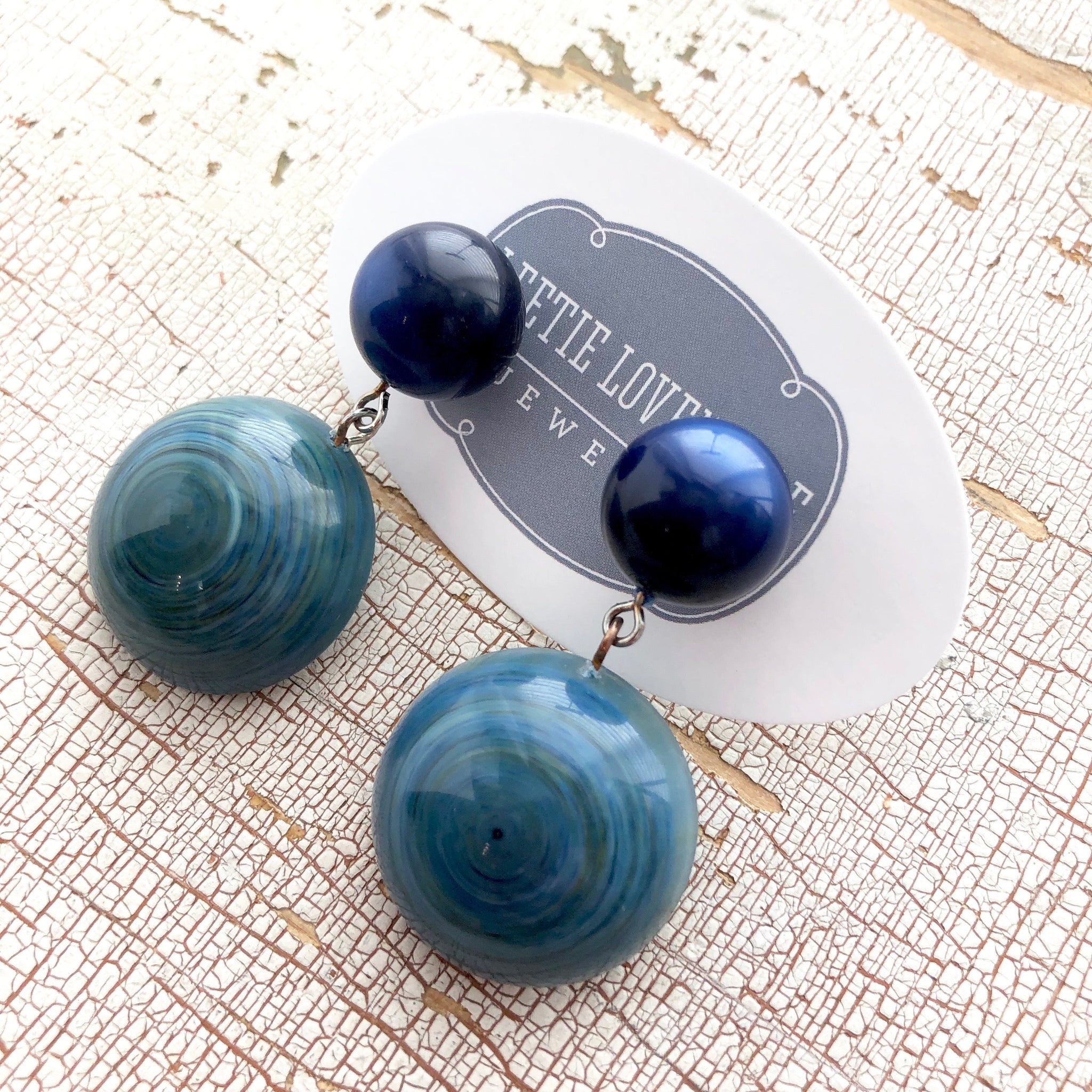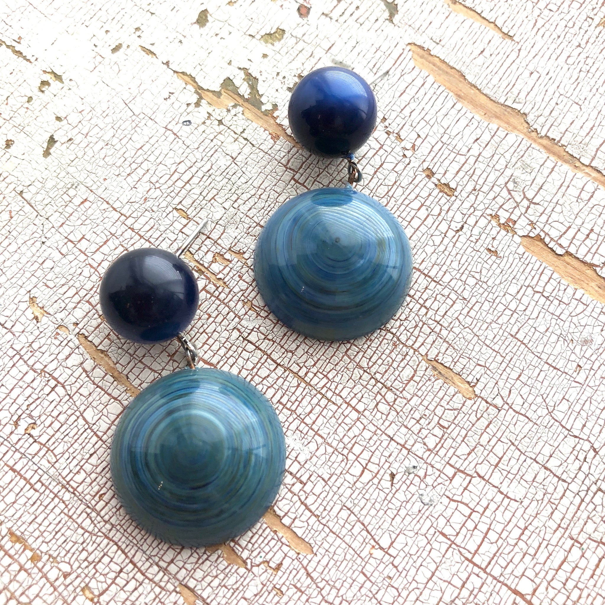 Teal marbled blue drops with dark blue moonglow studs. Geometric lucite earrings made with vintage parts. These are big & make a statement. Mod meets 80's opulence. Measures just under 1.75" or 42mm from top to bottom, but super light weight with just enough swing to make a statement.