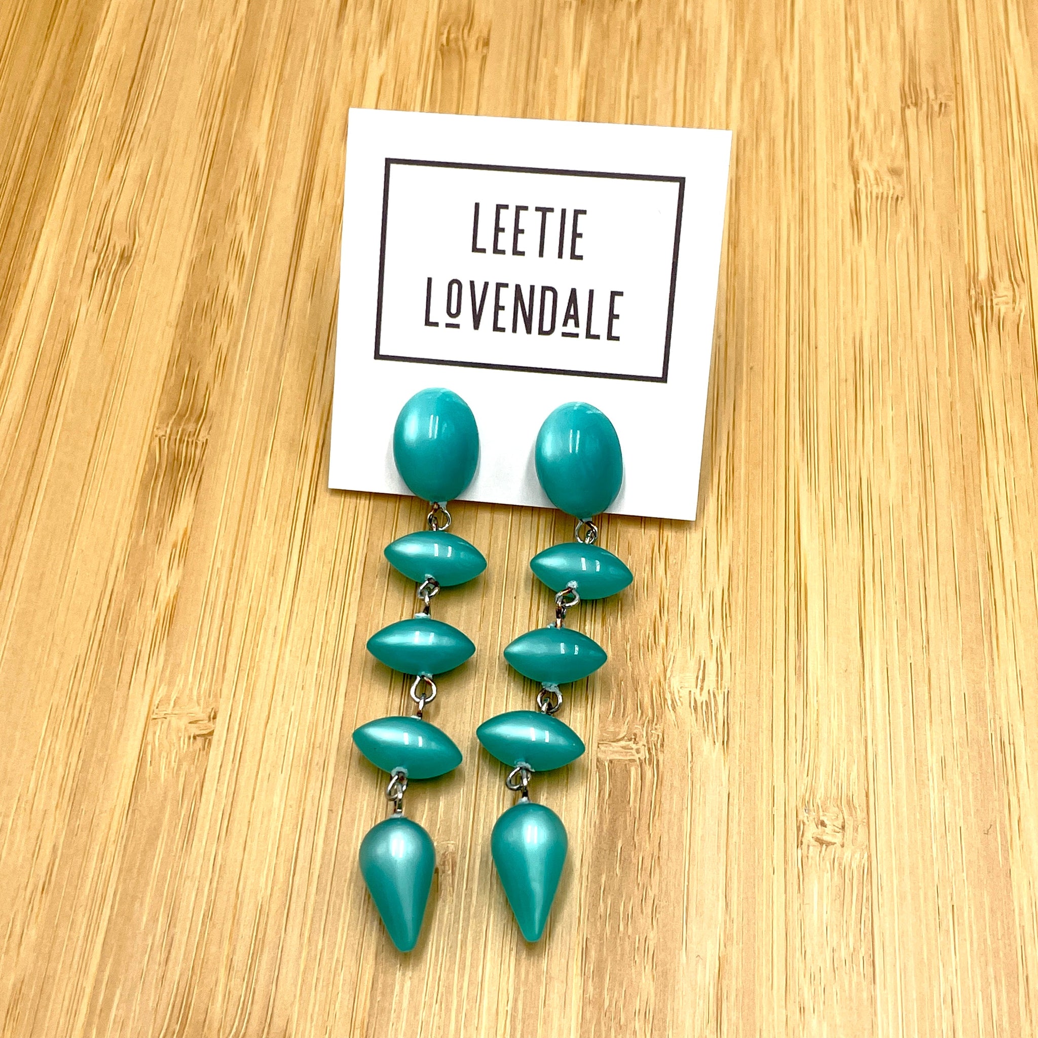 Teal moonglow pod-shapes cascade from an oval flat-backed stud. Each earring measures just over 3" or 78mm in length & are super light weight.