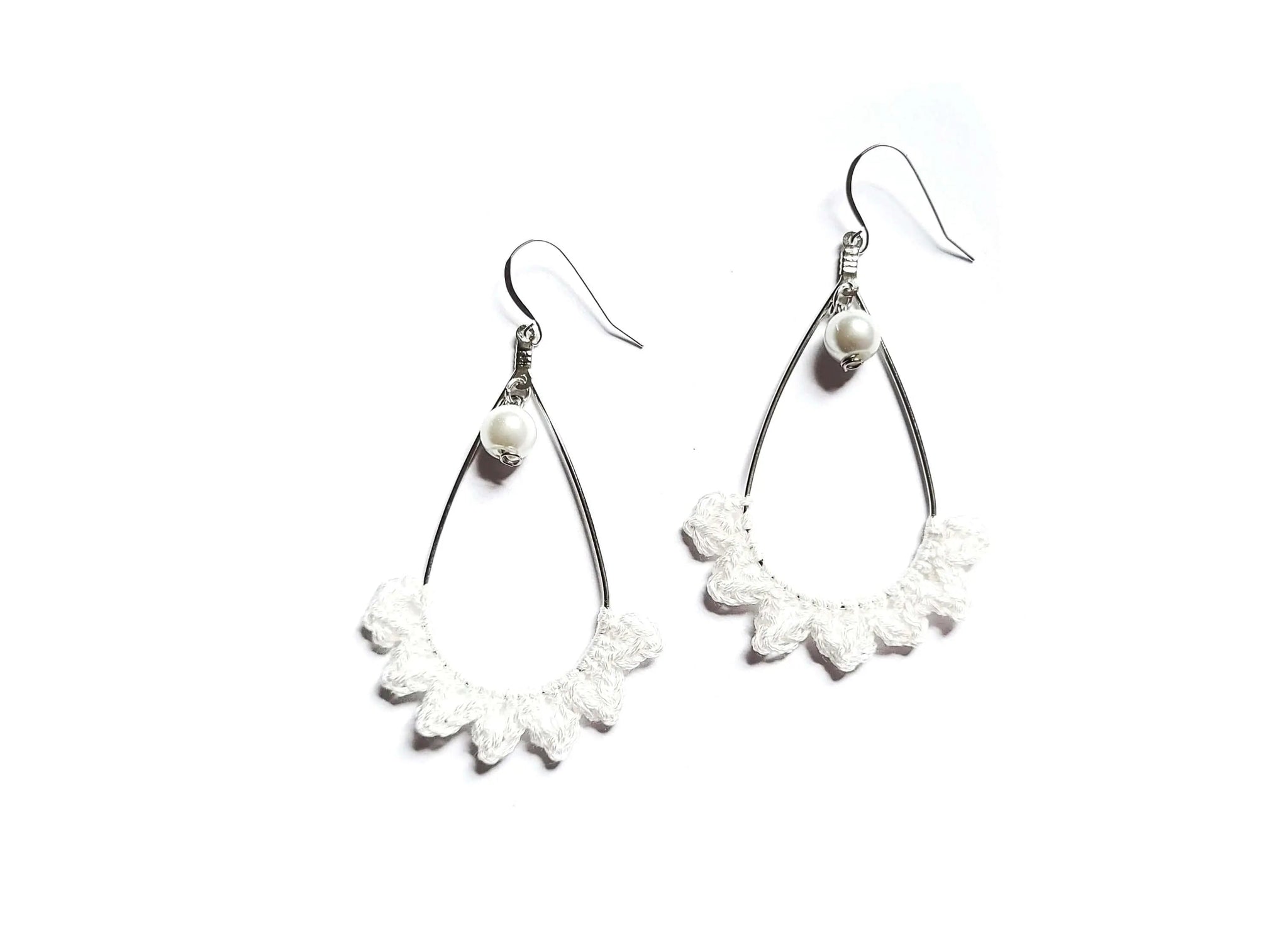 Imagine: Delicate threads, hand-crocheted into whimsical wisps that dance with every move. A single, luminous pearl nestled at the heart, catching the light and whispering promises of elegance. These earrings are more than an accessory – they're a conversation starter, a touch of artistry whispering against your skin.