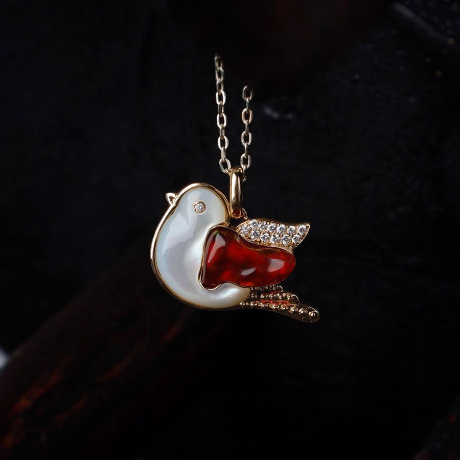 The Fat Pigeon - Mexican Fire Opal Diamond Pendant 18K Yellow Gold Adorable Bird Necklace.