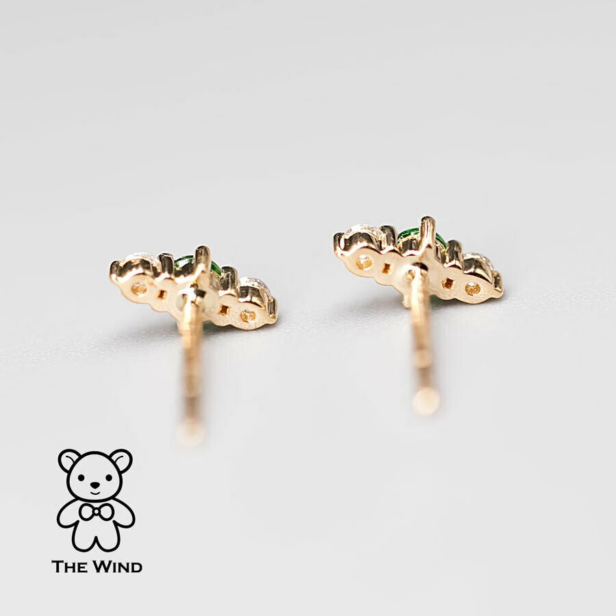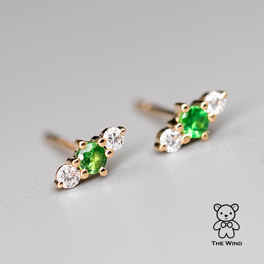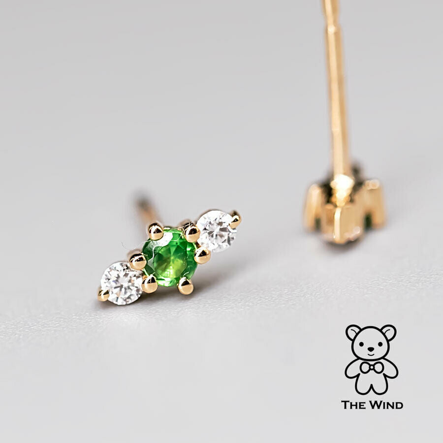 Three Stone Diamond Tsavorite Garnet Stud Earrings 18K Yellow Gold.