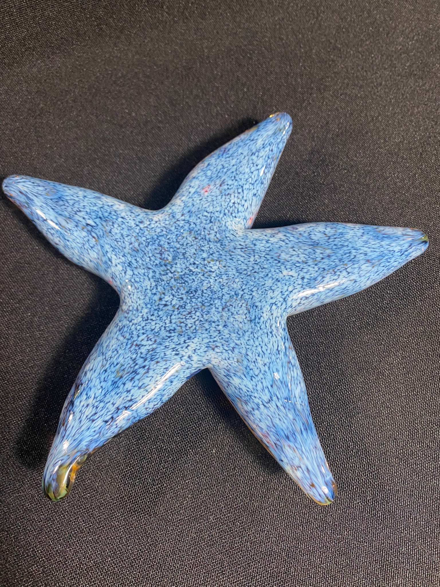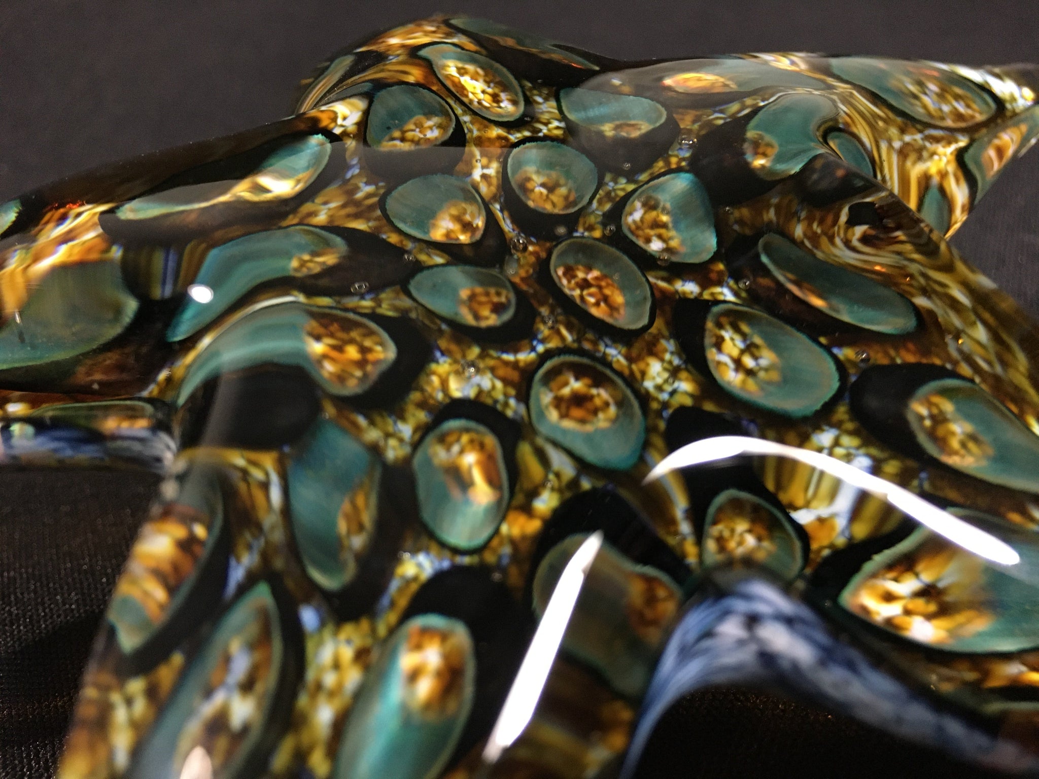 The Tide Pool Amber Barnacle Starfish is created by melting optical tubes of color into the molten glass. Then layers of color are added to the bottom and a thick layer of clear glass is added to the top, making the starfish optical and appear almost wet.