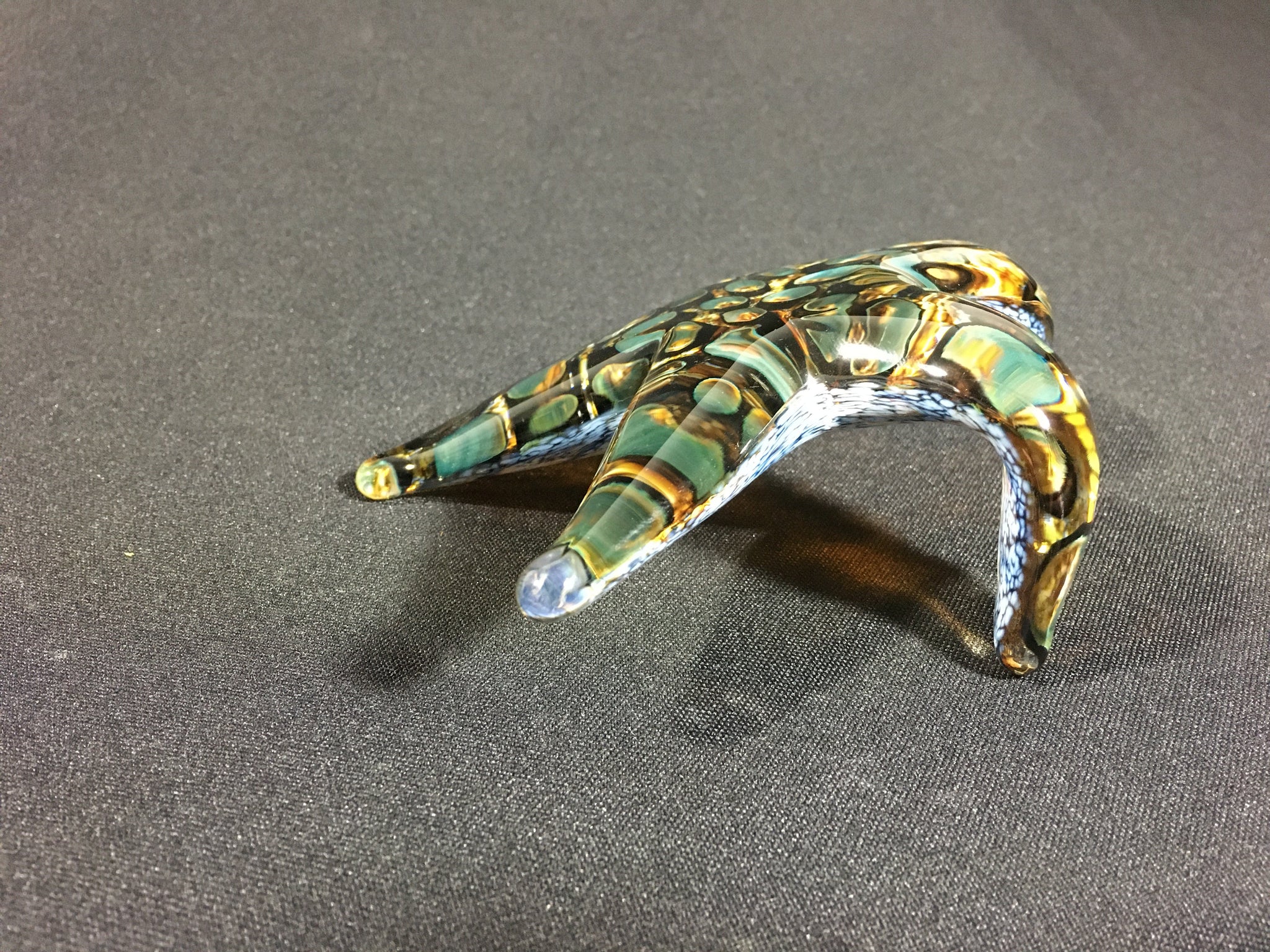 When the glass is hot, John lets the molten glass fall over the edge of a metal table, capturing the moment when the starfish is creeping away, just like it clings to rocks in the ocean.