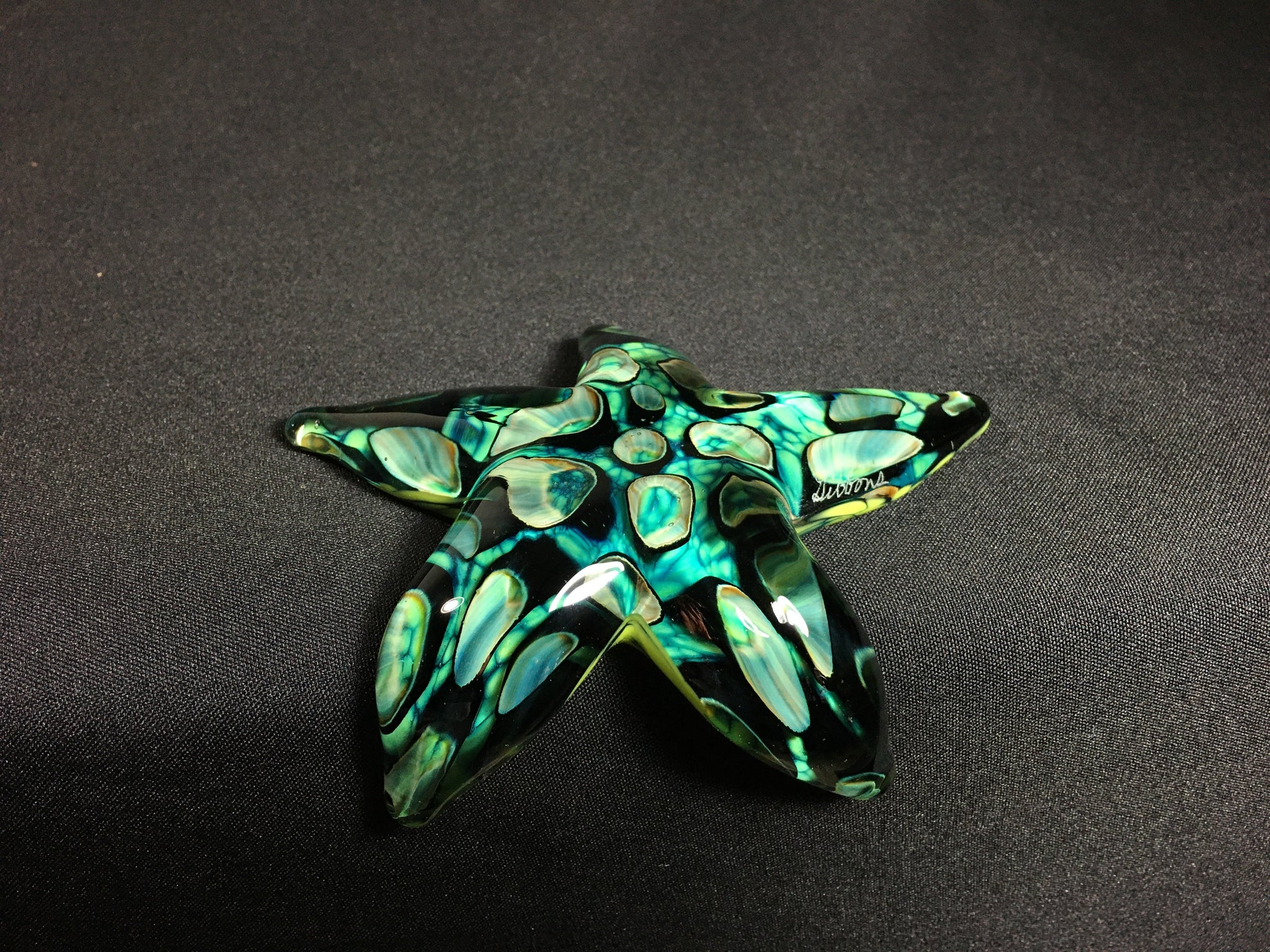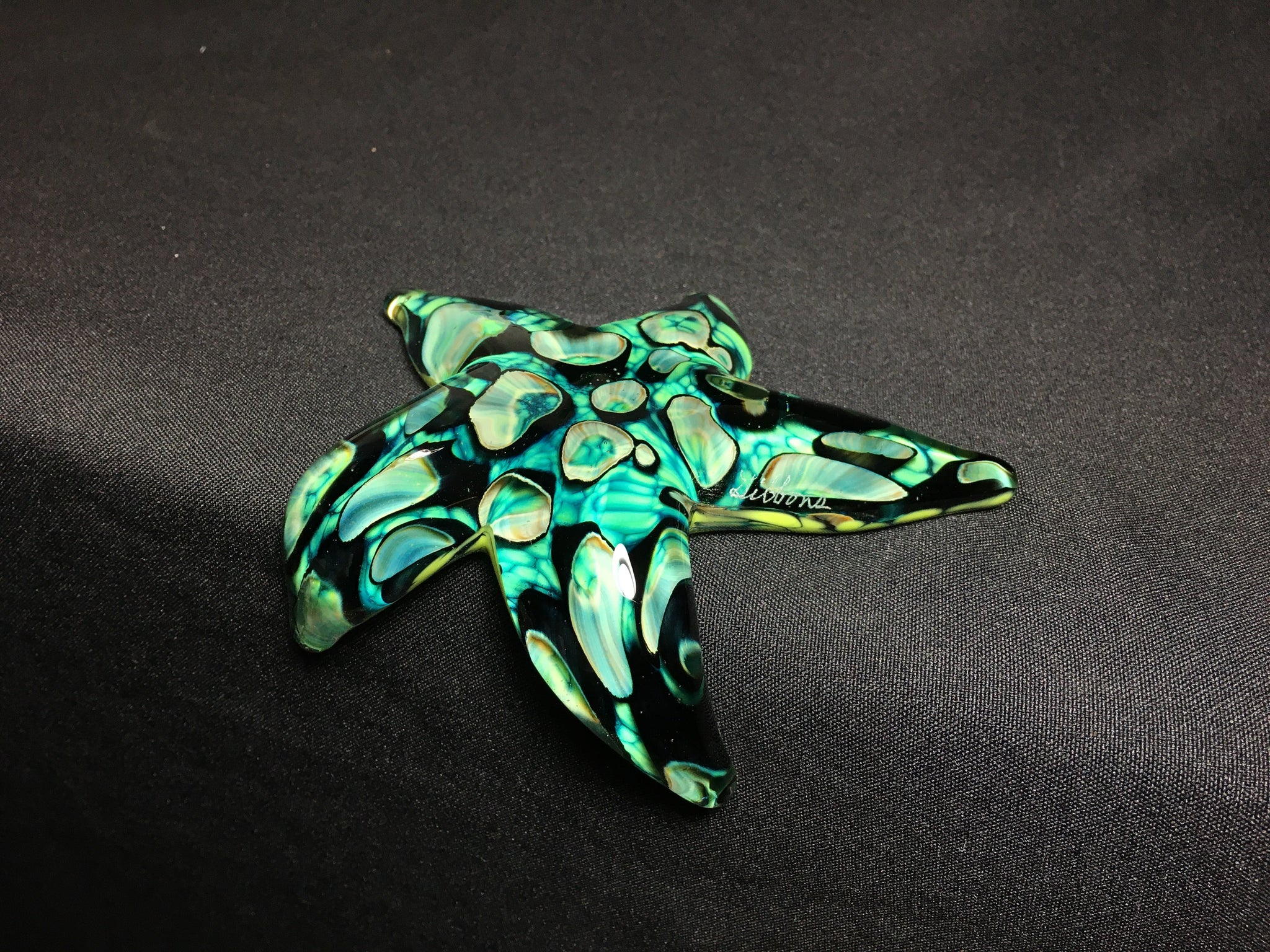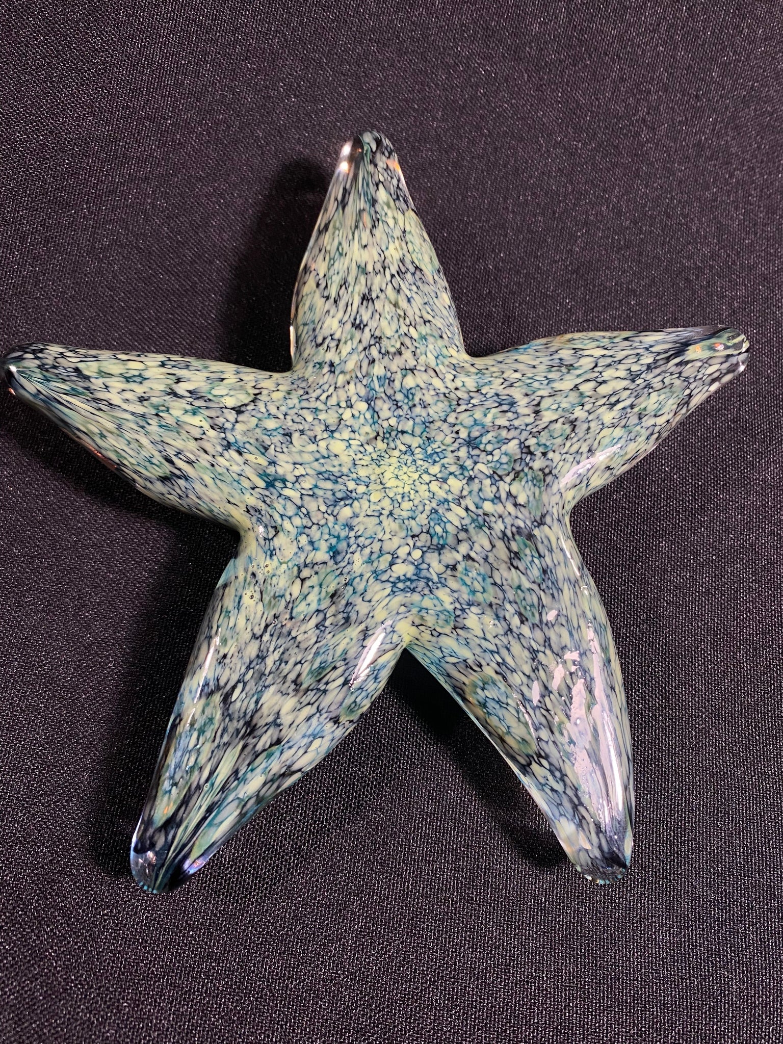 The Tide Pool Green Barnacle Starfish is created by melting optical tubes of color into the molten glass. Then layers of color are added to the bottom and a thick layer of clear glass is added to the top, making the starfish optical and appear almost wet.
