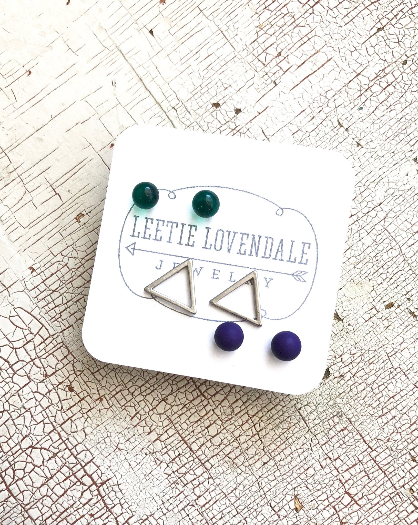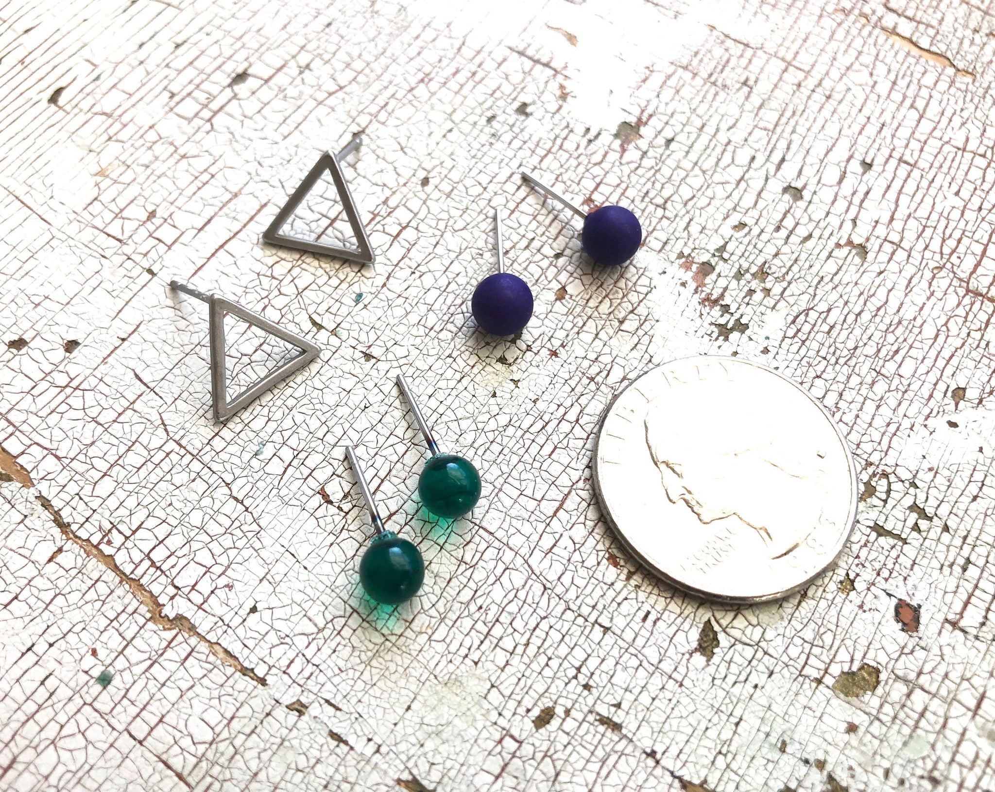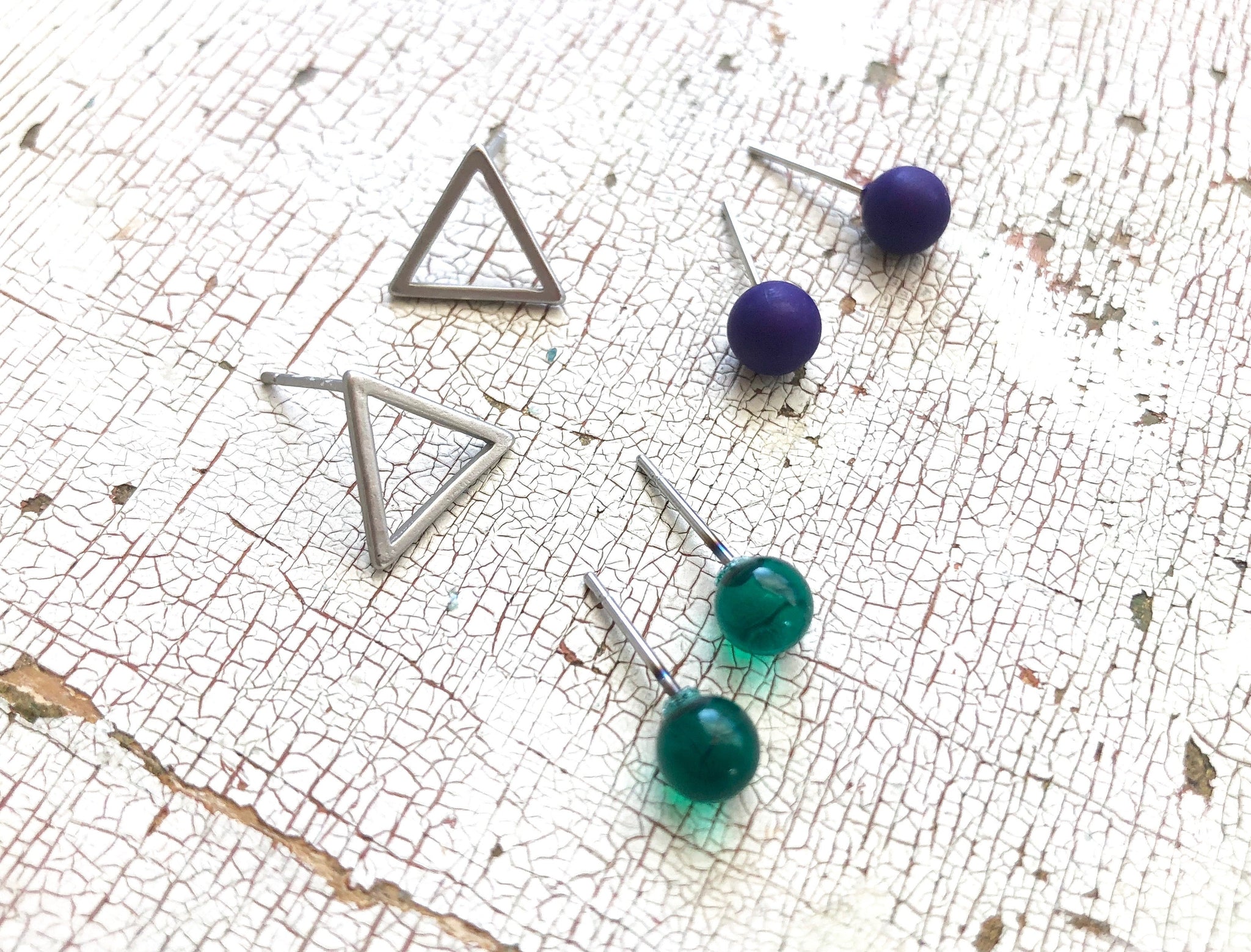 Tiny studs in emerald, cobalt blue & Frosted Silver. Geometric meets minimalist. This set of earrings includes a 3mm pair of emerald green transparent studs, a frosted silver geometric triangle stud, and a frosted cobalt blue 4mm stud. 3 pair of fabulous & fresh lucite stud or post earrings in the palette you've been looking for. The perfect retro post earring collection for gifting or expanding your own earring collection.