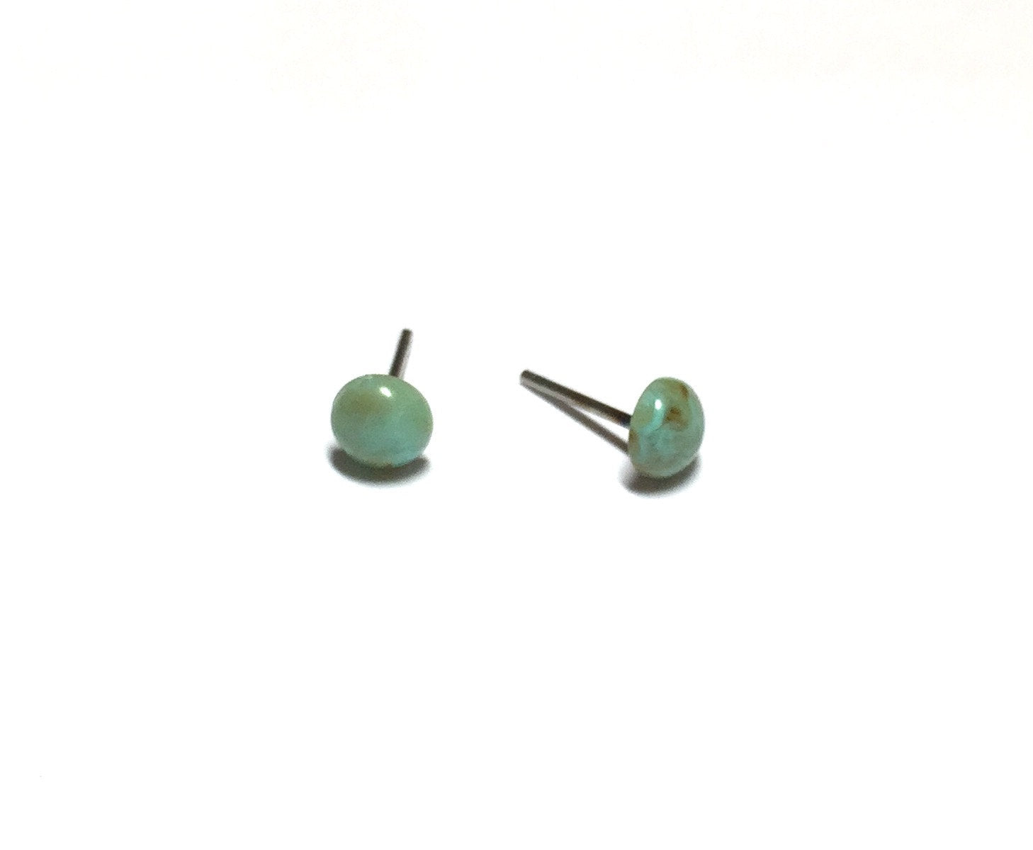 Tiny turquoise marbled stud earrings in a 5mm size. Tiny retro button stud shape. These are a natural looking turquoise with striations of grey throughout but made with old plastic parts.