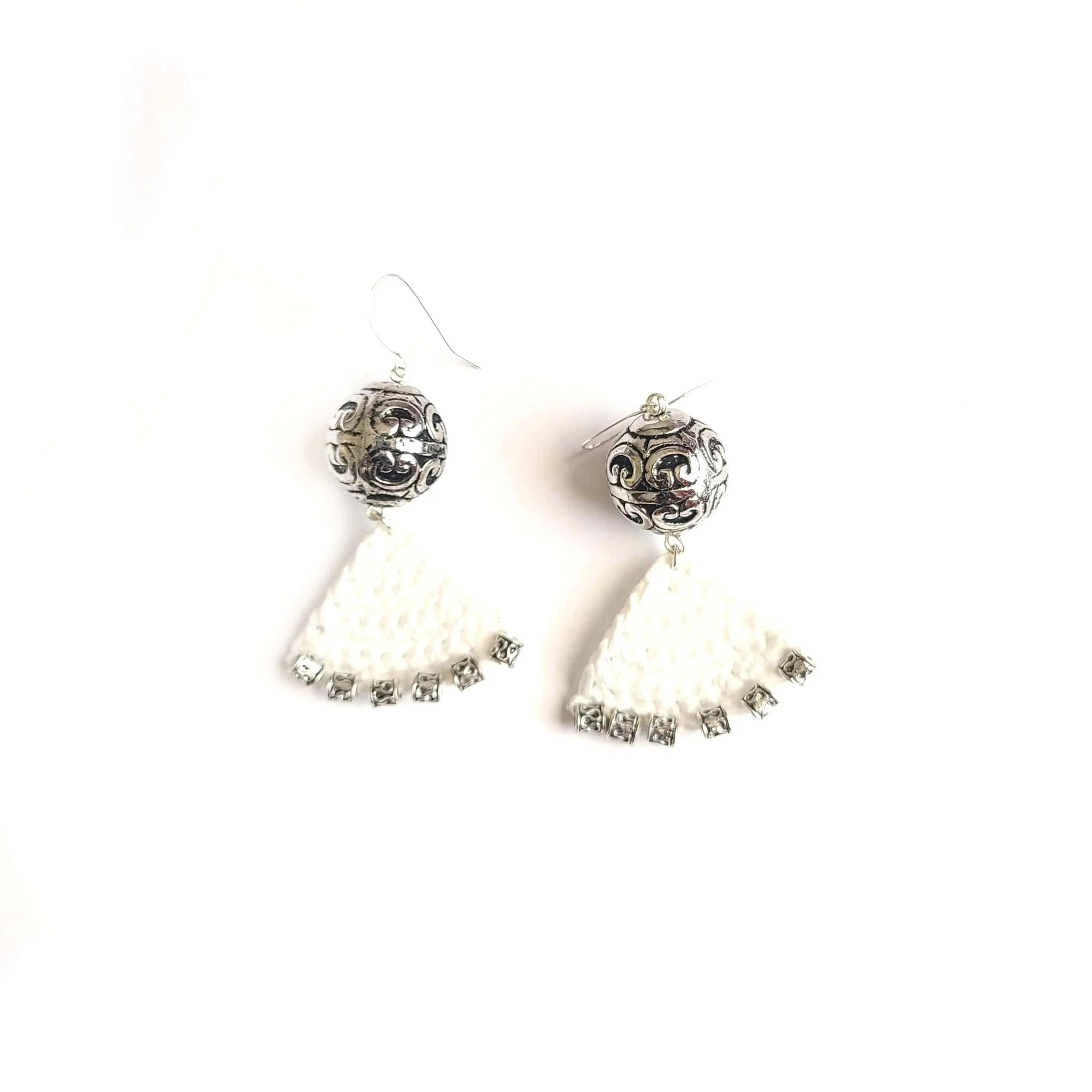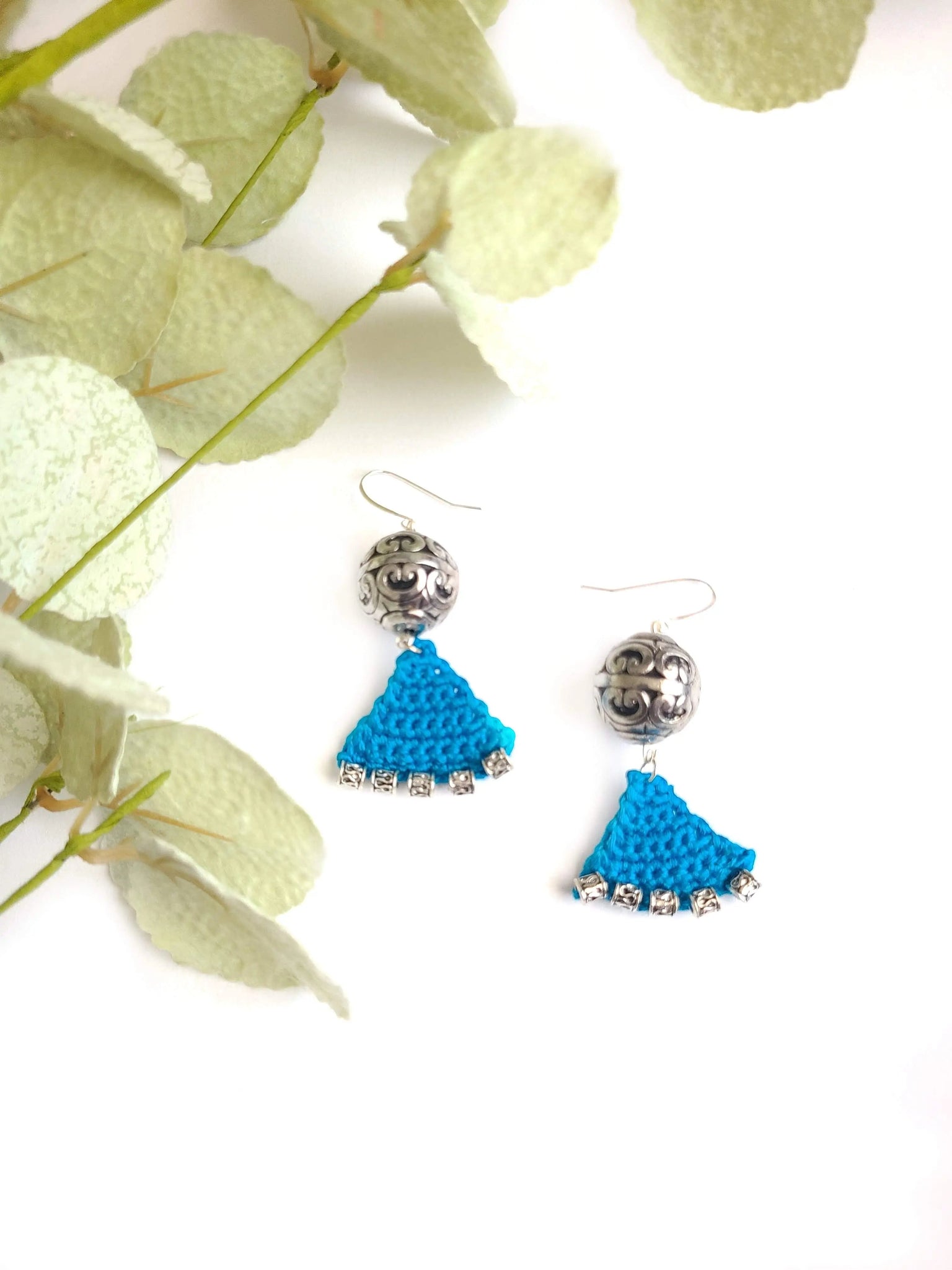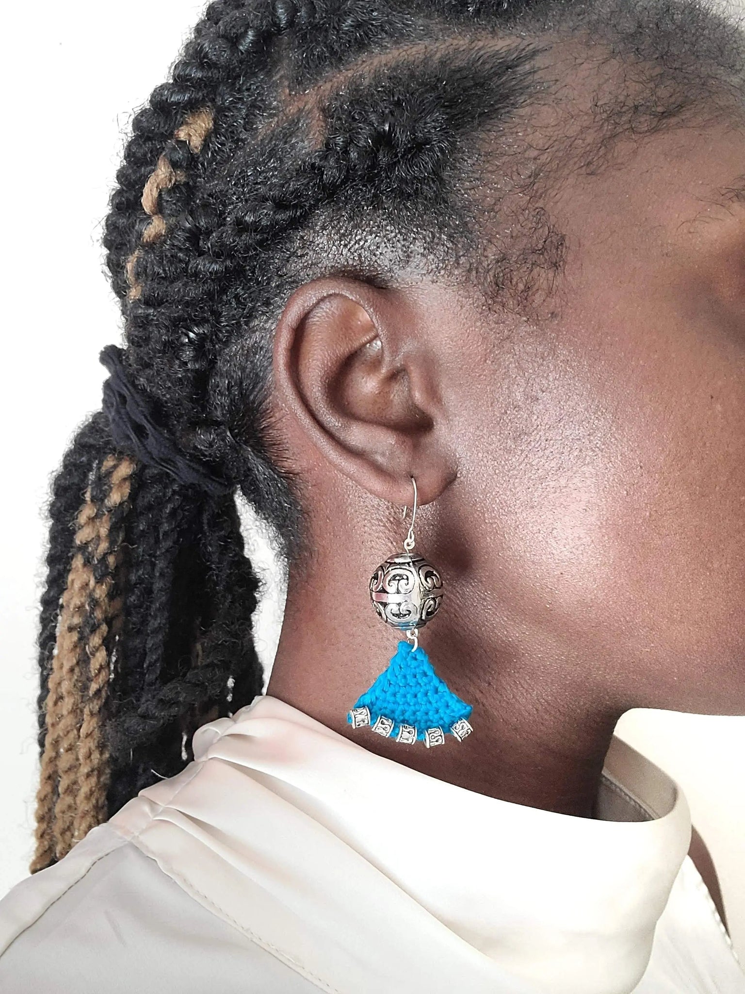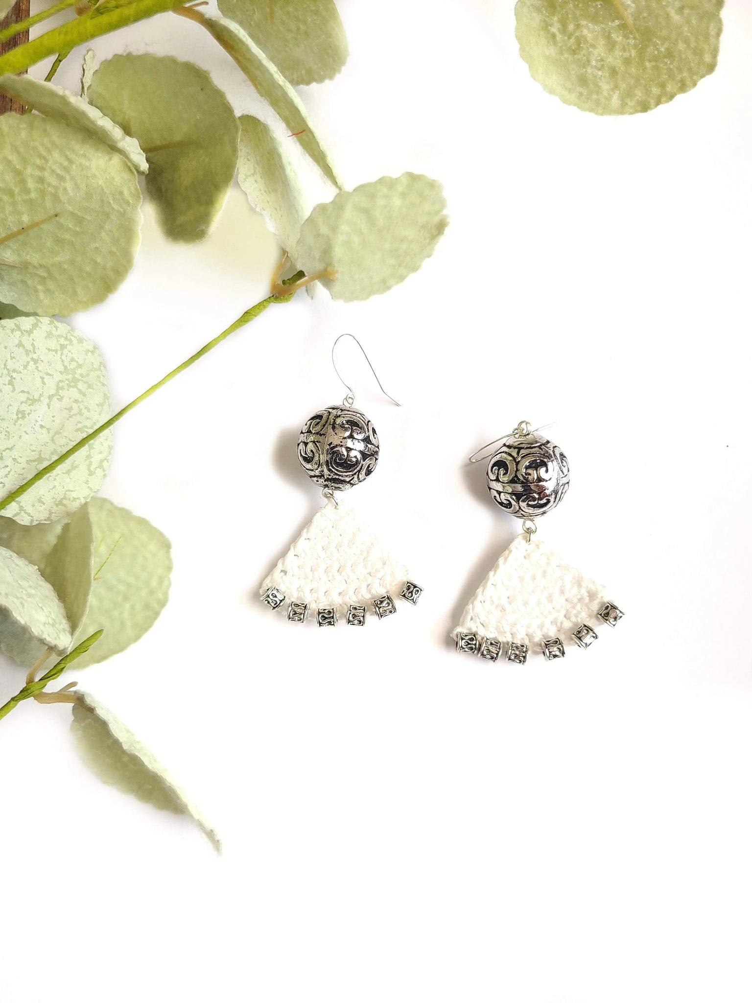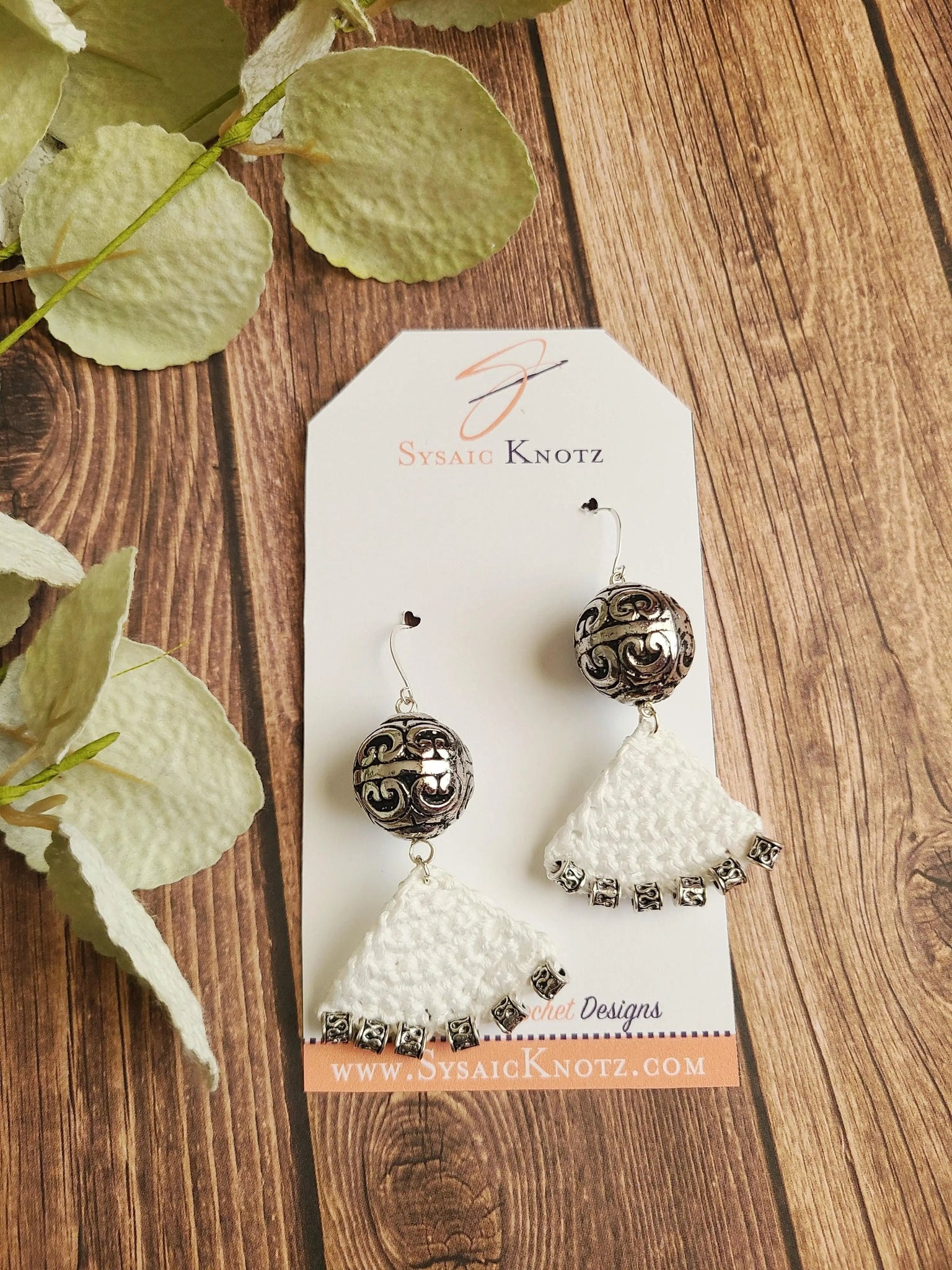 Now this style speaks to you if it's for you. You just know when you first see it! These tribal triangle dangle earrings are just what you've been looking for! A unique pair of creative earrings that joins cotton and metal together in a stunning way. The textured tunnel beads at the bottom are individually sewn onto the triangle and create a one of a kind look. Yes, since they are sewn on, there isn't going to be two pairs that exactly look identical! Plus the main piece, the triangle, is also handmade! The large metal sphere at the top is thick to hold it's shape but not heavy, so this pair won't tug on your ear lobes. These triangle earrings make a great gift!