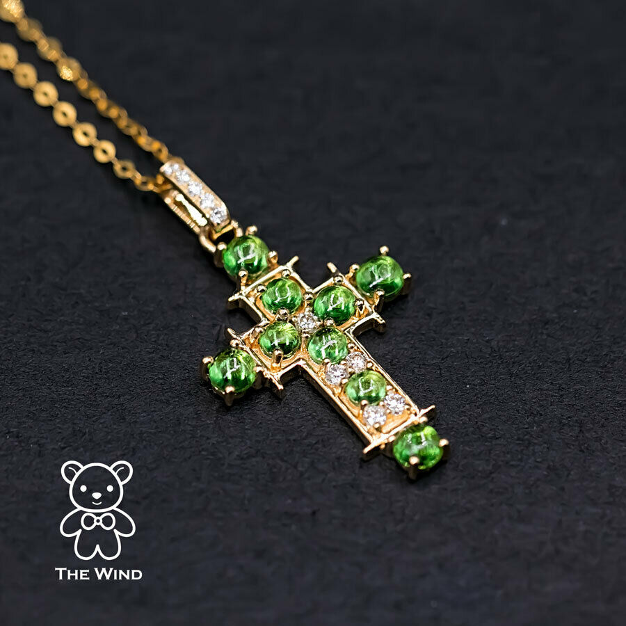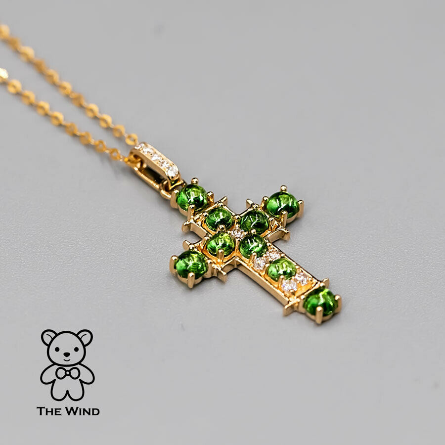 Tsavorite Garnet and Diamond Cross Pendant Necklace 18K Yellow Gold