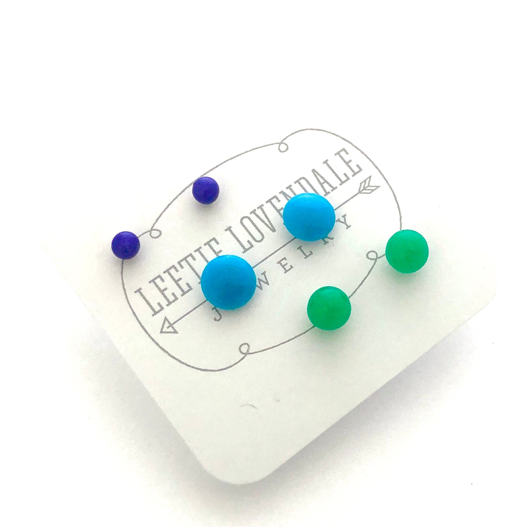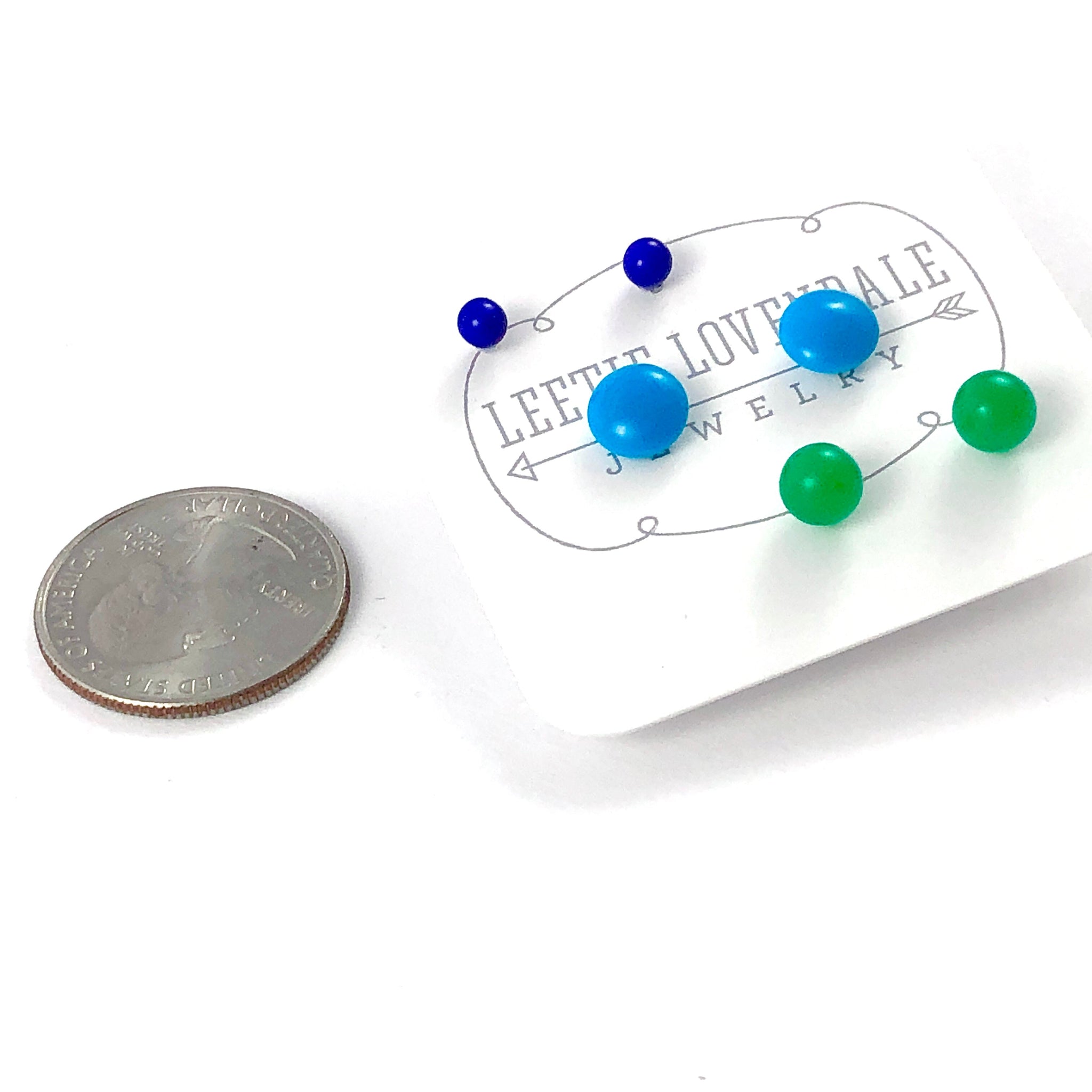 Tiny stud earrings in turquoise, cobalt blue and kelly green in little round bead & disc shapes. Sizes are about 3-7mm.