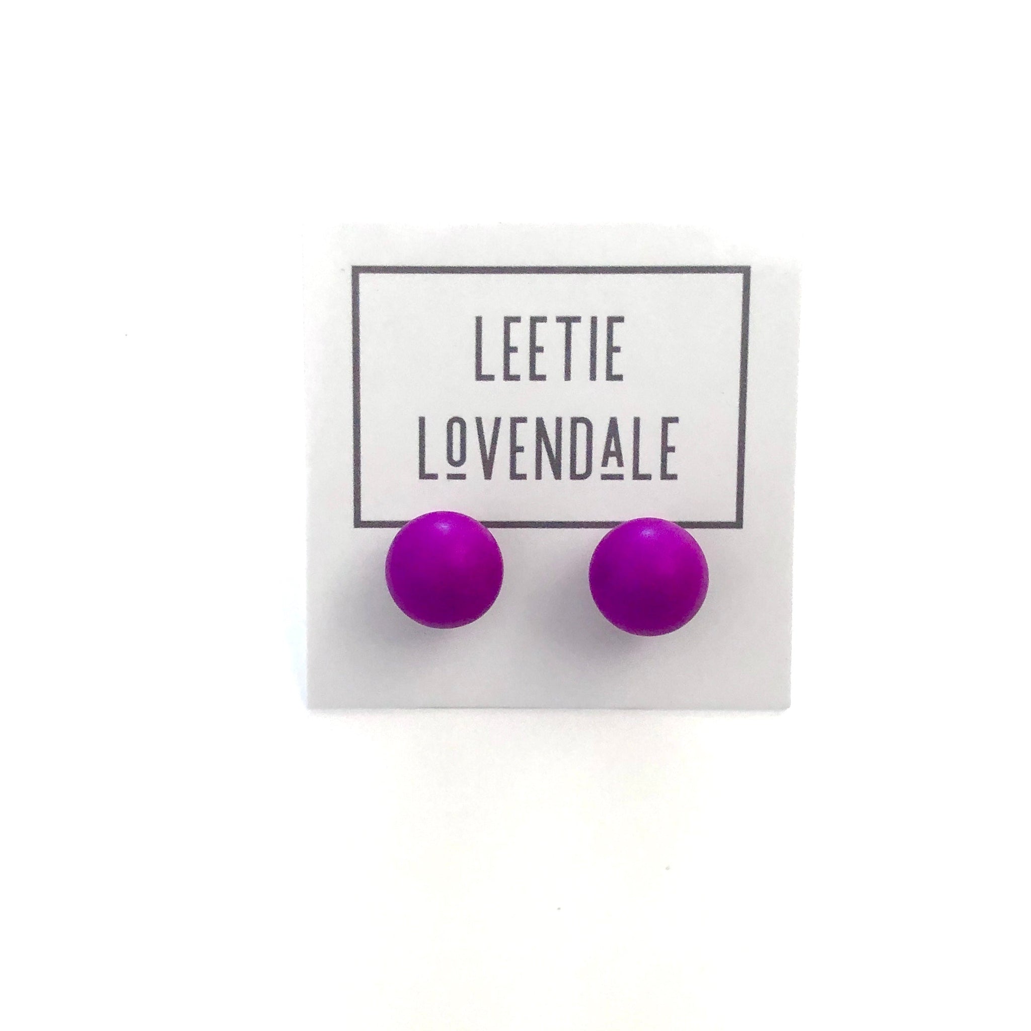 Violet purple stud earrings in a great shiny opaque finish. Each bead or post earrings measures approximately 12mm in diameter - a great classic size that will put that retro touch on your look. See the pic of this same style being worn in another color, for an idea of the size & scale.