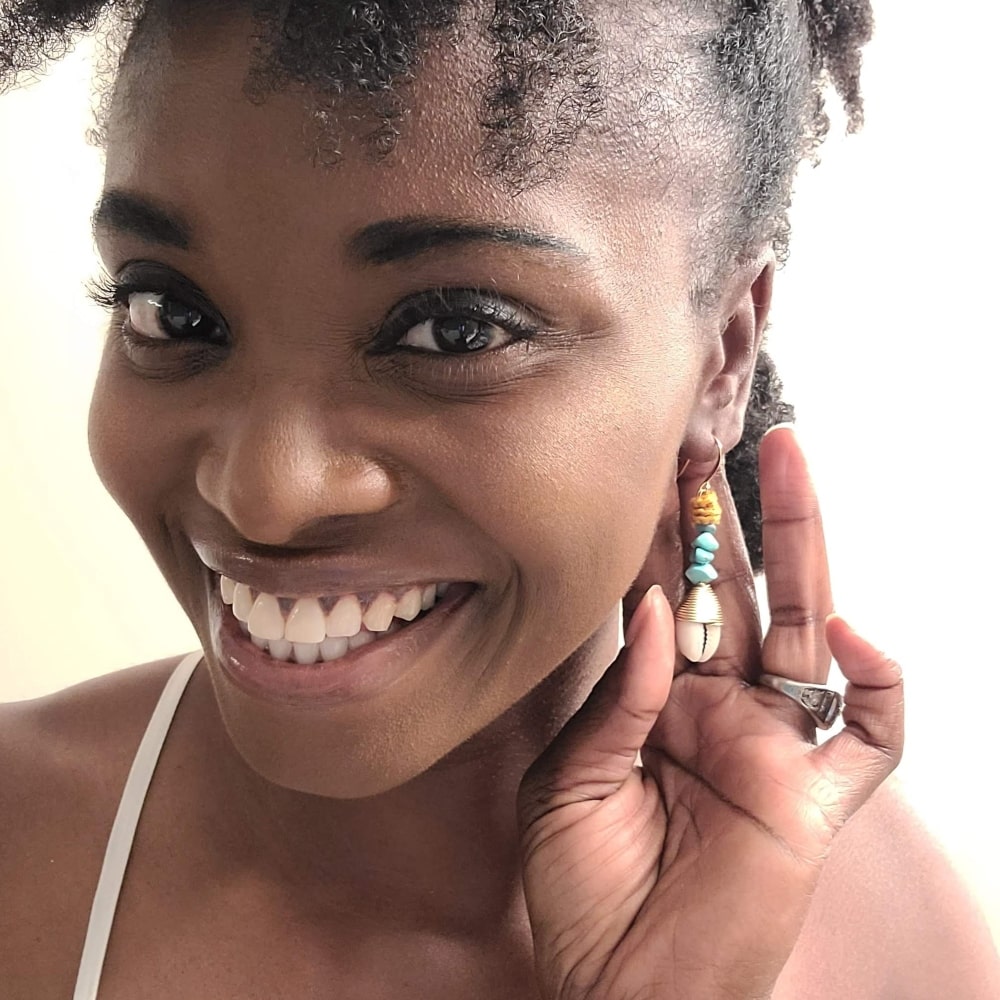 Are you ready to make a bold and unforgettable fashion statement? Look no further than these exquisite Wagnerite Turquoise Dangle Earrings. These stunning cowrie shell earrings gold are the perfect accessory to unleash your inner diva and express your unique style. Crafted with the utmost attention to detail, these earrings feature vibrant turquoise gemstones that will instantly elevate any outfit. The Wagnerite stone is the center piece in this pair. The dangle design adds an extra touch of elegance and movement, ensuring all eyes will be on you. Whether you're attending a glamorous event or simply want to add a touch of glamour to your everyday look, these earrings are the ultimate choice. With their timeless beauty and undeniable charm, the Wagnerite Turquoise stone Earrings are a must-have addition to your jewelry collection. Embrace your individuality and make a statement with these breathtaking earrings that are sure to turn heads wherever you go. Go ahead, unleash your inner diva and let your style shine with these show-stopping earrings.