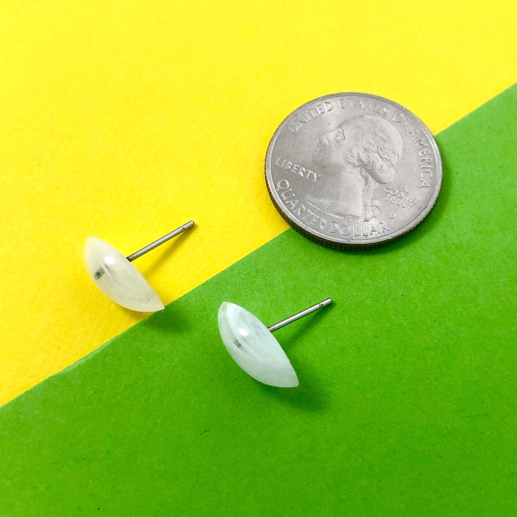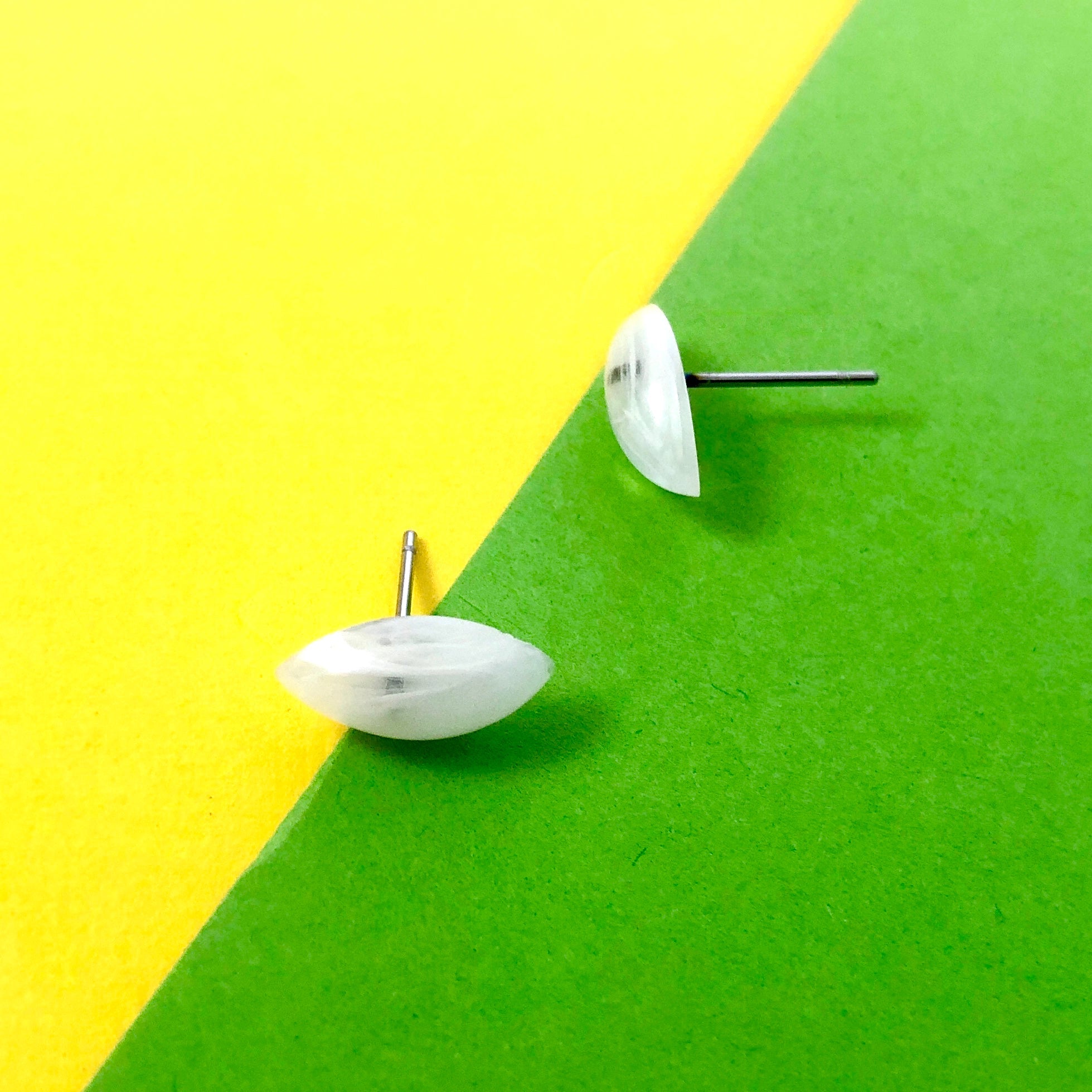 White and Clear button earrings with a shiny finish in a diamante marquis shape. These retro button studs are a great pointed oval shape. This size measures just over 1/5" in length.