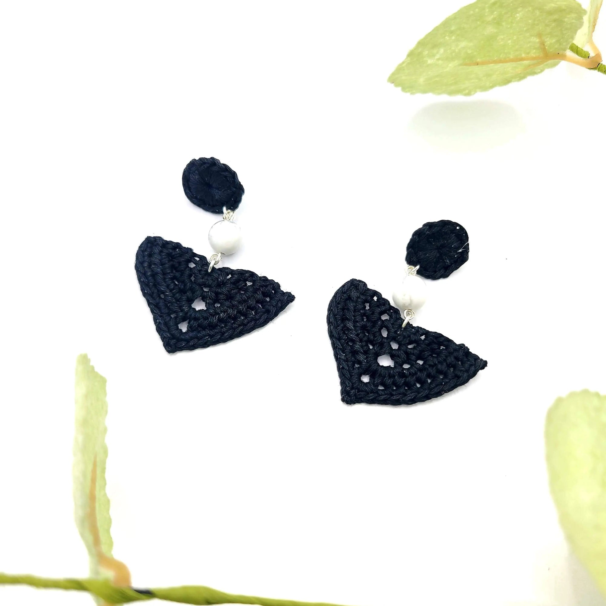 A stunning handmade design is just what you need and this pair of creative earrings delivers! The white howlite crystal dangles in this design as it is connected to a handmade triangle. Head out to your event with this handmade creation and enjoy yourself! This design is very light weight because it was created with 100% cotton threads and stiffened to hold it's shape for you. Quality backings are used made with surgical steel so don't worry about the post backing damaging your ear.