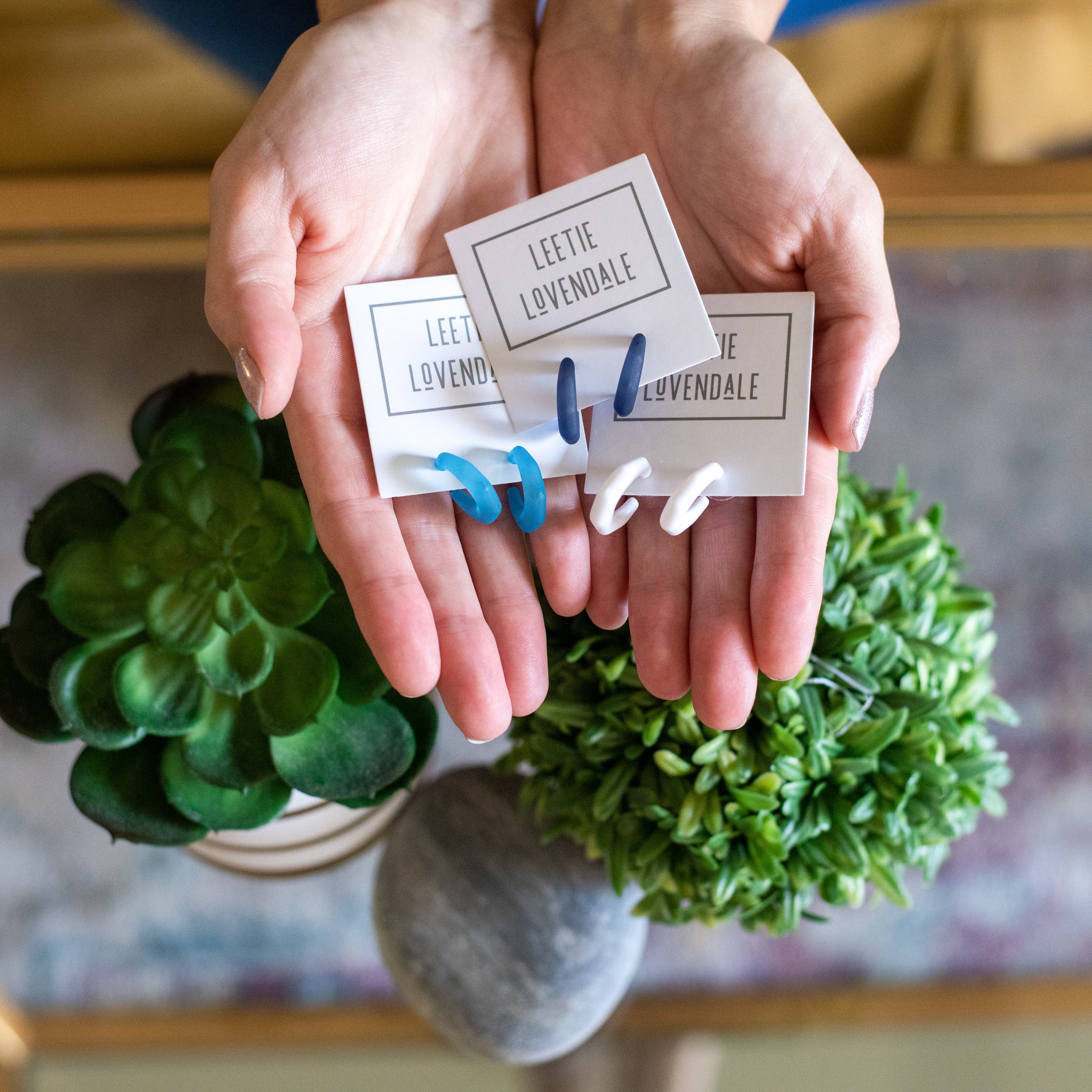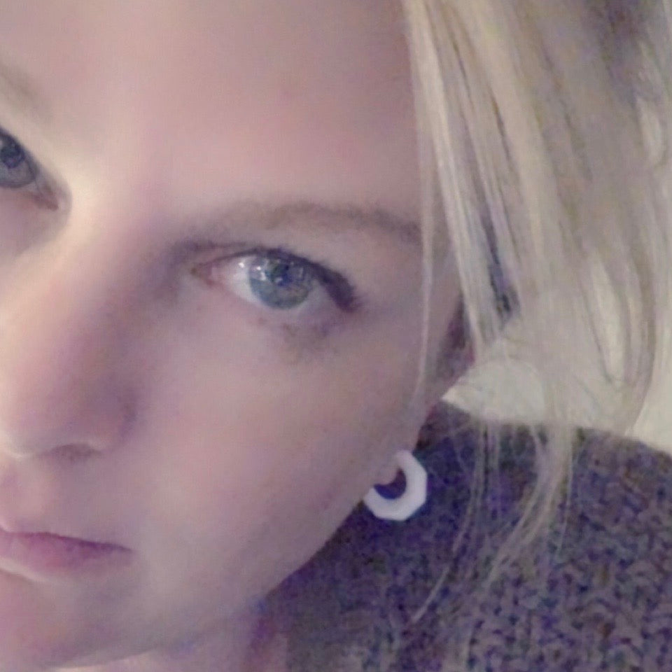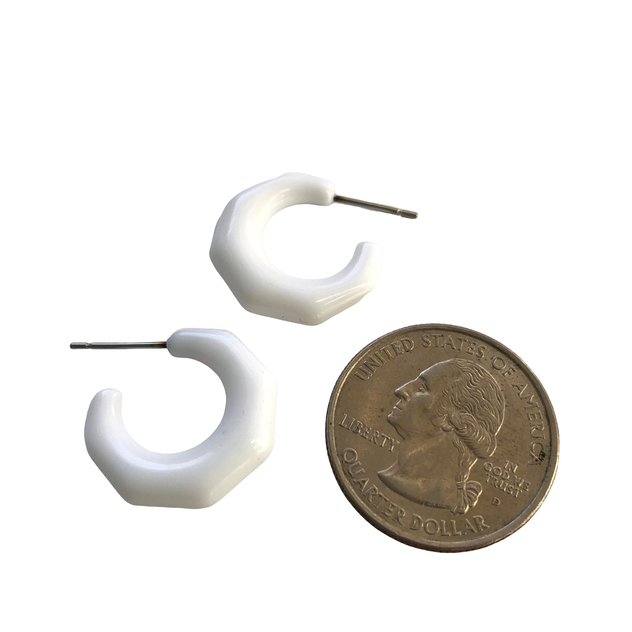 White mini beveled hoop earrings shaped like little lobe-hugging octagons. Made with vintage lucite, each is 3/4" in diameter. This style is known as the Kit Hoop. Super retro, geometric shape, these are a light-weight earring set by hand with surgical steel. We unearthed these vintage plastics in Europe & finish them off in our AZ studio.