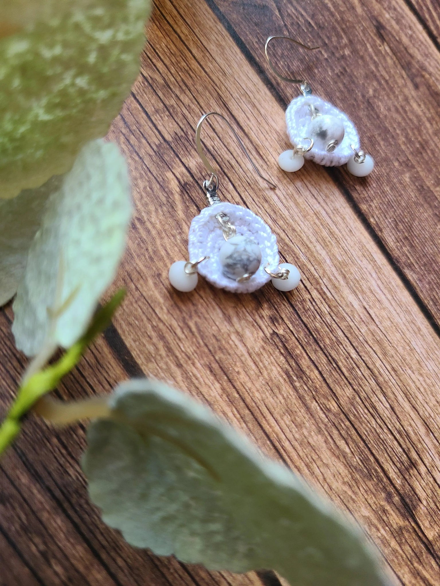 A pair of petite drop earrings that are so dainty and light weight. The sterling silver ear wire makes this pair of creative earrings very ear friendly. Smile because this design is handmade! The pocket that holds the Howlite gemstone in the middle has been created by crochet techniques and attached to a sturdy metal ring. Then two small white stones are placed on the bottom to dangle freely.