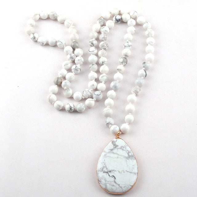 This splendid and soothing White Turquoise Mala Necklace is carefully handmade with 108 natural genuine White Turquoise beads as well as a beautiful and prominent stone pendant and a black tassel.